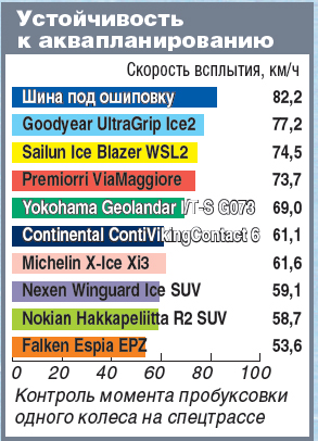 Шина, созданная под ошиповку, цепко держится за лед на кольце, но при резких маневрах она скользкая и непрогнозируемая, поэтому по обледенелой трассе скорость на этих покрышках заметно ниже, чем у конкурентов (на 20–30 км/ч). Зато у этой модели наилучшая устойчивость к аквапланированию и ею обеспечивается отличная управляемость на мокром асфальте.