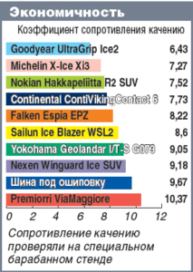 Возвращаясь к основным конкурентам, хочется отметить, что шины премиум-четверки получили очень близкие итоговые оценки, хотя каждая из них имеет свои особенности и демонстрирует свои преимущества в разных дисциплинах. Модель финского производителя Nokian Hakkapeliitta R2 SUV традиционно является королевой ледовых трасс. Но она показала хорошие результаты и на других покрытиях, поэтому заслуженно разделила первое место с одним из соперников. Второй победитель – шина Goodyear UltraGrip Ice2, которая хорошо себя проявила на мокром асфальте, является экономичной, очень комфортой и не имеет провальных свойств по другим характеристикам.