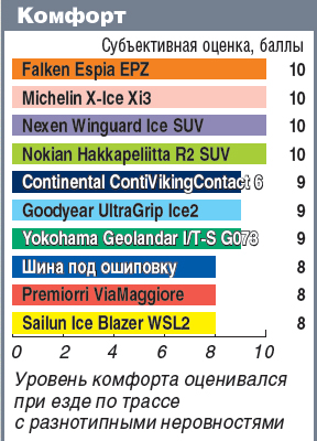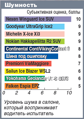 Согласно результатам теста, выбранная шина обладает плохой управляемостью как на льду, так и на укатанном снегу и обеспечивает низкую разгонную динамику. На асфальте ее свойства средние, но по устойчивости к аквапланированию и управляемости на мокром покрытии она даже в числе лидеров. Хотя это в большей степени заслуга конструкции самой покрышки, а не отсутствия шипов.