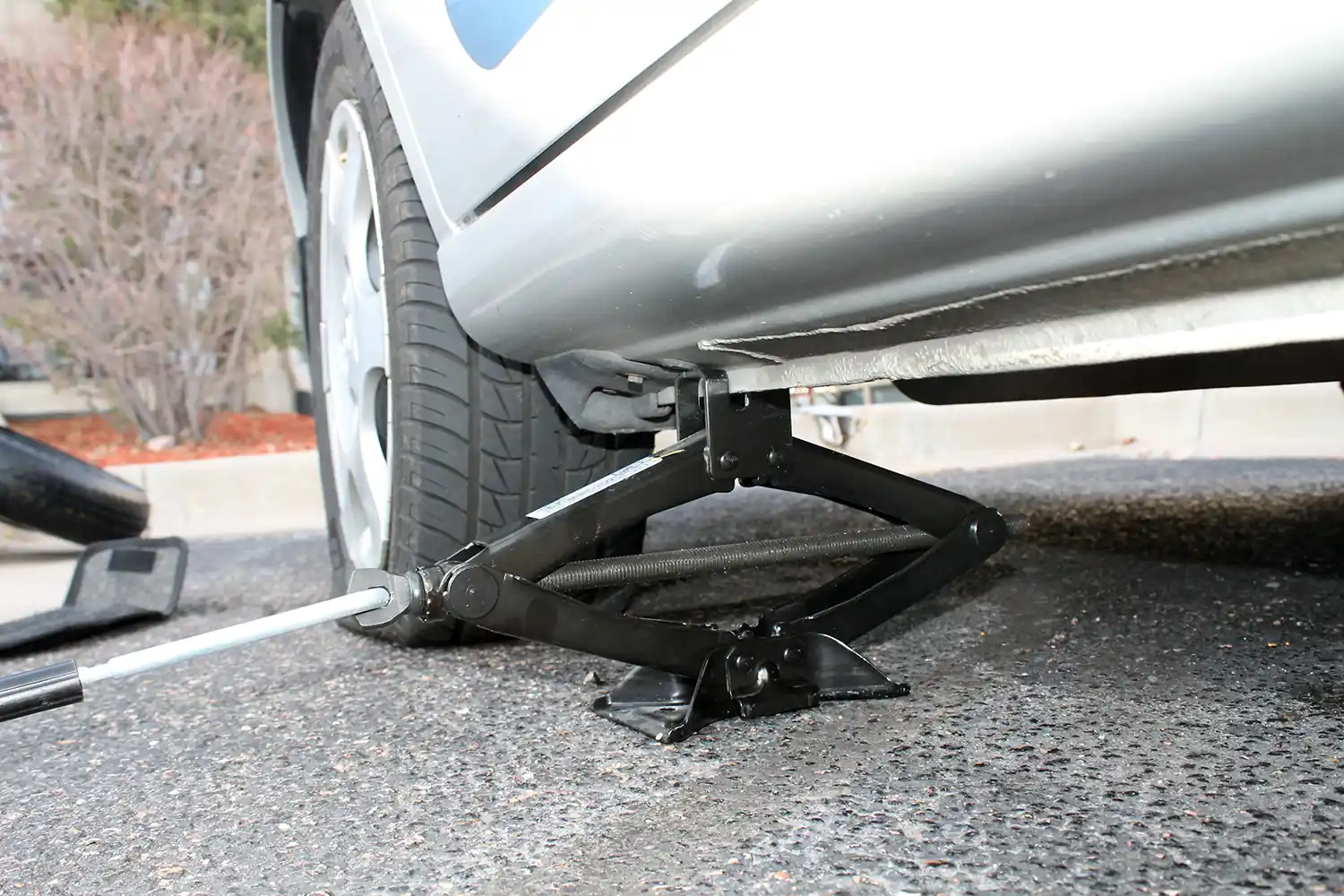 Еще раз убедитесь, что машина заглушена, на “ручнике” и на передаче (или в “паркинге” в случае с АКПП). Если есть брусок, то не помешает подложить его под колесо другой оси, которое расположено по диагонали, от меняемого. Дополнительная фиксация машины не будет лишней. Также необходимо, чтобы сам домкрат стоял на твердой, по возможности ровной поверхности. Если такой нет или дело происходит зимой, подложите под него ровную доску или что-то прочное и плоское, чтобы домкрат не уходил вниз.