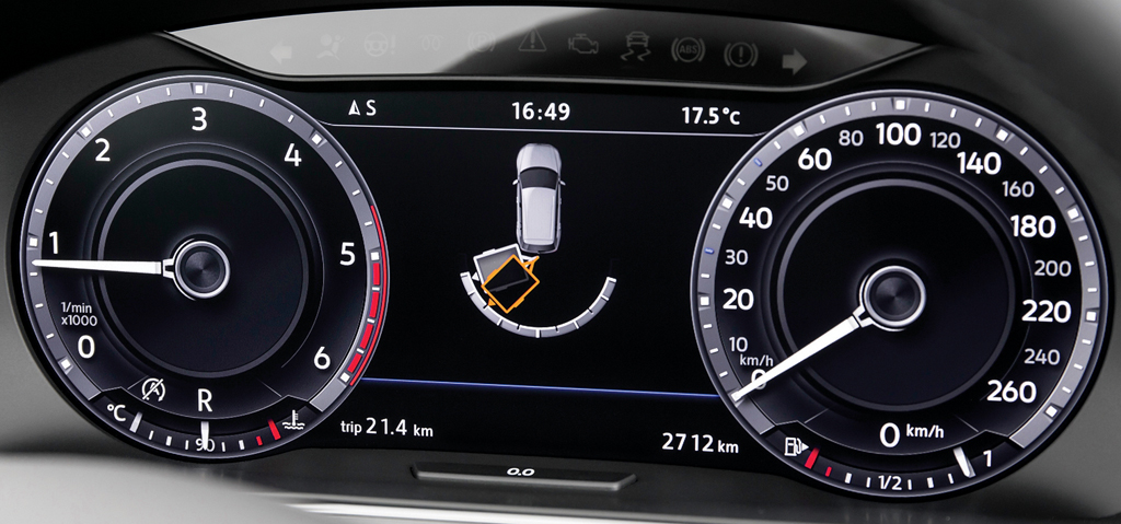 А чего не видит водитель, то видит система предупреждения наезда и столкновения Front Assist. При резком сближении с другой машиной или когда перед капотом вашей машины появляется пешеход, раздается звуковой и визуальный сигнал, педаль тормоза обостряется, а газа – становится легче, подсказывая водителю правильные действия и сокращая время срабатывания механизмов. Но если и этот момент проспать, то система применяет экстренное торможение.