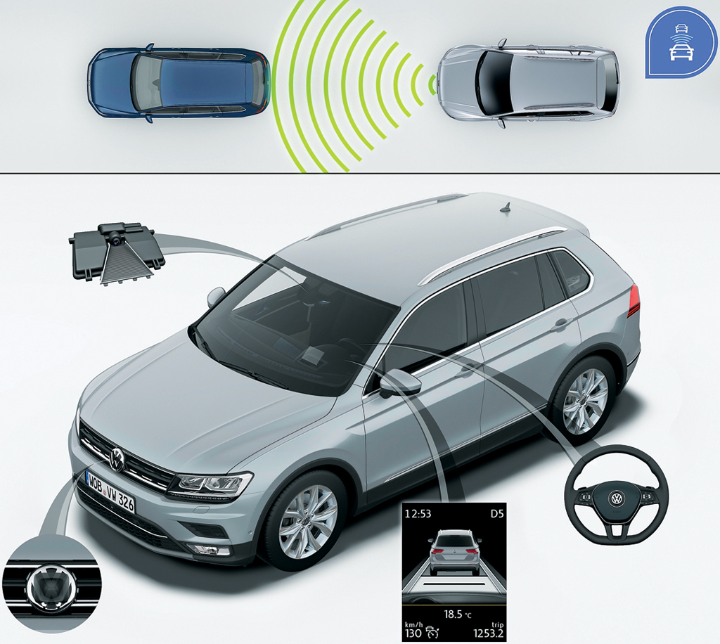 Еще больший эффект – когда данная система работает в паре с адаптивным круиз-контролем. Достаточно его включить – выставить ограничение максимальной скорости и выбрать дистанцию до впереди идущего транспорта. После чего машина самостоятельно разгоняется и замедляется до полной остановки в заданных границах. Причем система адаптируется, даже исходя из выбранного водителем режима движения. Например, быстрее разгоняя Tiguan в спортивном режиме и спокойнее – в комфортном или эконом-режиме.