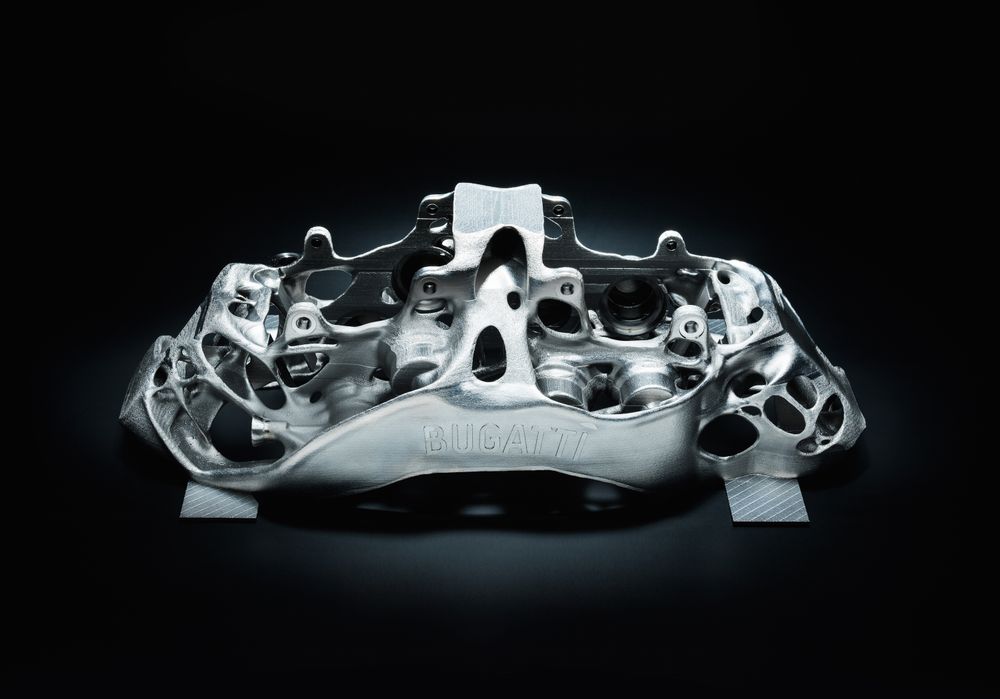 Они заменят алюминиевые суппорты на модели Chiron. Новая деталь из тиана на 40% легче и при этом более прочная. Производство одного такого суппорта занимает аж 45 часов, в течении которых один за одним накладываются 2213 слоев титанового сплава, затем заготовка проходит термообработку при температуре 700 градусов. После этого следует 11 часов финишной обработки детали.
