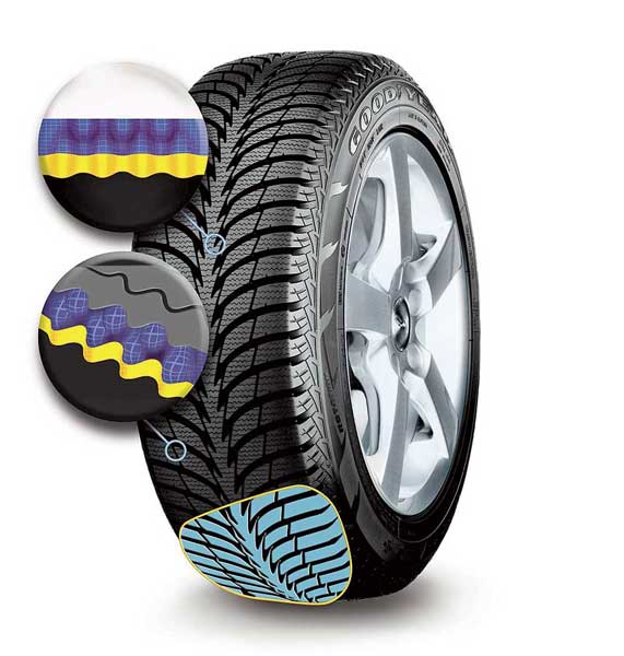 Свою новинку к этому сезону подготовила и компания Goodyear. В ассортименте ее продукции появилась зимняя шина для мягких европейских зим – UltraGrip Ice+. В ее конструкции применена технология ActiveGrip, которая сочетает двойной состав протектора и гибридные дренажные канавки. Верхний слой протектора в этой покрышке представляет собой более мягкий состав для улучшенного сцепления на льду, сохраняющий эластичность при очень низких температурах. В качестве основы протектора используется более твердая резиновая смесь, отвечающая за управляемость при средних температурах. Гибридные дренажные канавки – это индивидуальный рисунок дренажных канавок для каждого слоя резины протектора. Они представляют собой сочетание сетчатых канавок в мягкой резине верхнего слоя и зигзагообразных – в твердой резине нижнего слоя. Такая конструкция, по утверждению создателей шины, разработана специально для обеспечения продольной жесткости протектора по всей его глубине, что дает превосходное сцепление как на снегу, так и на льду в течение всего срока эксплуатации покрышки.Шина имеет симметричный V-образный рисунок протектора с крупными канавками, которые ориентированы на эффективный отвод воды и снежной каши из пятна контакта, а также на обеспечение хорошего тягового усилия при движении по снегу. Для борьбы с обледенелыми поверхностями в блоках протектора нарезаны ламели.