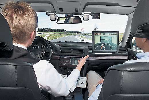 Для повышения безопасности автомобили все чаще оборудуют дополнительными системами, как правило, со звуковыми датчиками, которые помогают контролировать обстановку на дороге. В экстренных ситуациях они подают водителю сигналы и при отсутствии реакции со стороны последнего способны вмешиваться в работу двигателя и активизировать тормозную систему. Компания Bosch недавно подключила к процессу изучения обстановки на дороге еще один «механизм» информатора – видеосистему, названную информатором направления. Ее главный элемент – цифровые мини-видеокамеры, которые передают информацию в электронном виде бортовому компьютеру автомобиля. Для слежения за происходящим впереди камера устанавливается за лобовым стеклом в районе зеркала заднего вида, рядом с датчиком дождя. Сзади видеокамеры монтируются в бампер и транслируют изображение на дисплей на уровне головы водителя. Кстати, видео в данном случае дополняет ультразвуковую систему помощи при парковке автомобиля.