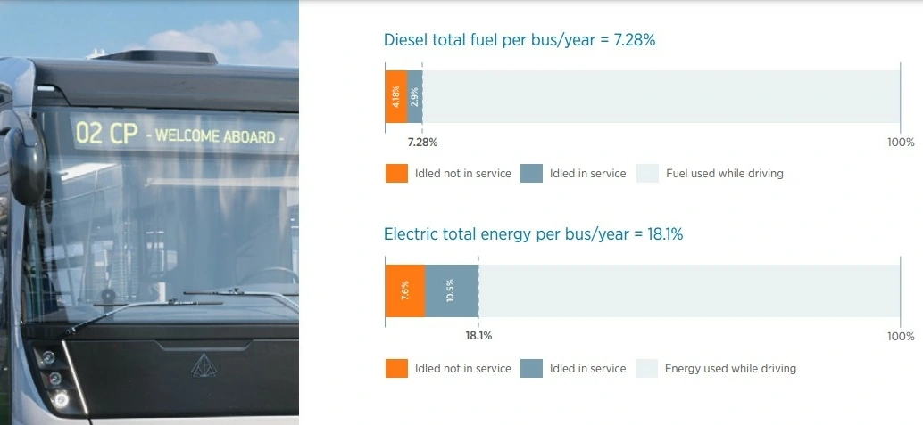 В Европе и в Северной Америке было проанализировано свыше 8,5 млн сеансов холостого хода электрических автобусов и 3,4 млн. – дизельных. При этом, если машина в этом режиме работала свыше 10 мин., то это фиксировалась как эксплуатация вне маршрута (not is service).