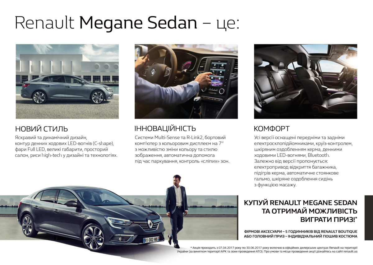 Серед всіх власників нової моделі Megane седан, які придбають автомобіль в квітні-червні 2017 р., будуть розіграні цінні призи: