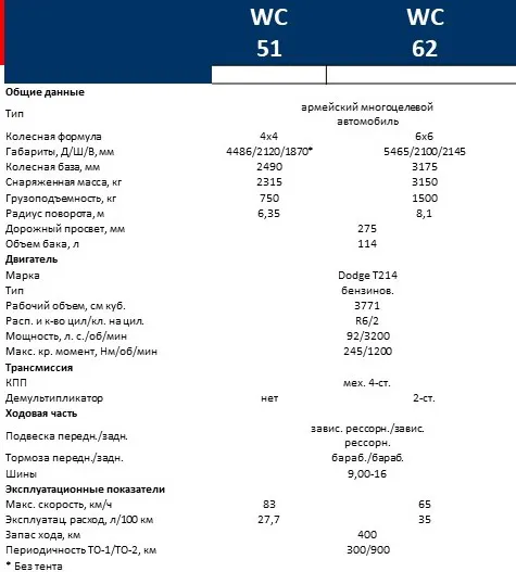Львиная доля машин нового поколения выпускалась в виде пикапов с «мягкой», брезентовой 2-местной кабиной и откидывающимся на капот ветровым стеклом. Металлический грузовой кузов был универсального типа, вдоль бортов устанавливались складывающиеся скамейки на 8 человек. Модель без лебедки обозначалась WC 51, с лебедкой на переднем бампере – WC 52. В руководствах эту машину иногда называли тягачом. И действительно, имевший высокие тягово-сцепные свойства автомобиль успешно применялся для буксировки 57-миллиметровых противотанковых пушек, 76-миллиметровых дивизионных орудий, а также минометов и легких зениток. Меньшее распространение получили санитарные машины WC 54. Они имели закрытый цельнометаллический кузов и предназначались для перевозки четырех лежачих или семерых сидячих раненых. Однотипные штабные автомобили носили индекс WC 55, в их салоне вместо носилок и мединструментов располагался стол для топографических карт и средства радиосвязи.