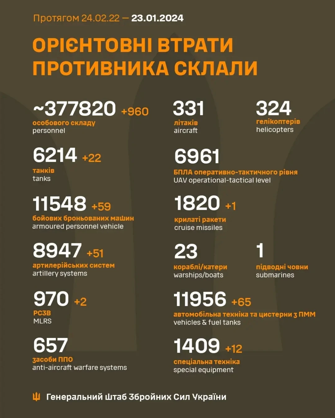 Как сообщает Генеральный штаб ВСУ, за минувшие сутки – 22 января 2024 года было подбито 22 российских танков (с начала полномасштабной войны – 6 214 ед.), а также 59 ед. бронетехники (всего – 11 548 ед.). Также сожжено 65 автомобилей и автоцистерн (всего – 11 956 ед.) и 12 ед. спецтехники (суммарно – 1 409 ед.).