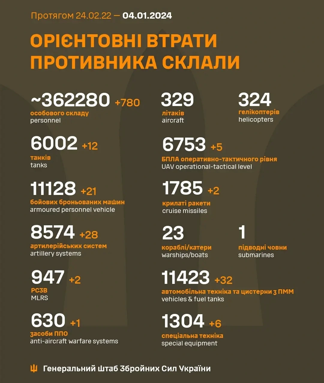 По данным Генерального штаба ВСУ, за прошедшие сутки, 3 января, российские оккупанты лишились 12 танков (всего за время полномасштабной войны подбито 6002 ед.) и 21 бронированной машины (общее количество – 11 128 ед.). Наши защитники плюс к этому уничтожили 32 ед. автомобилей и цистерн (общее количество – 11 423 ед.), а также 6 ед. спецтехники (всего – 1 304 ед.).