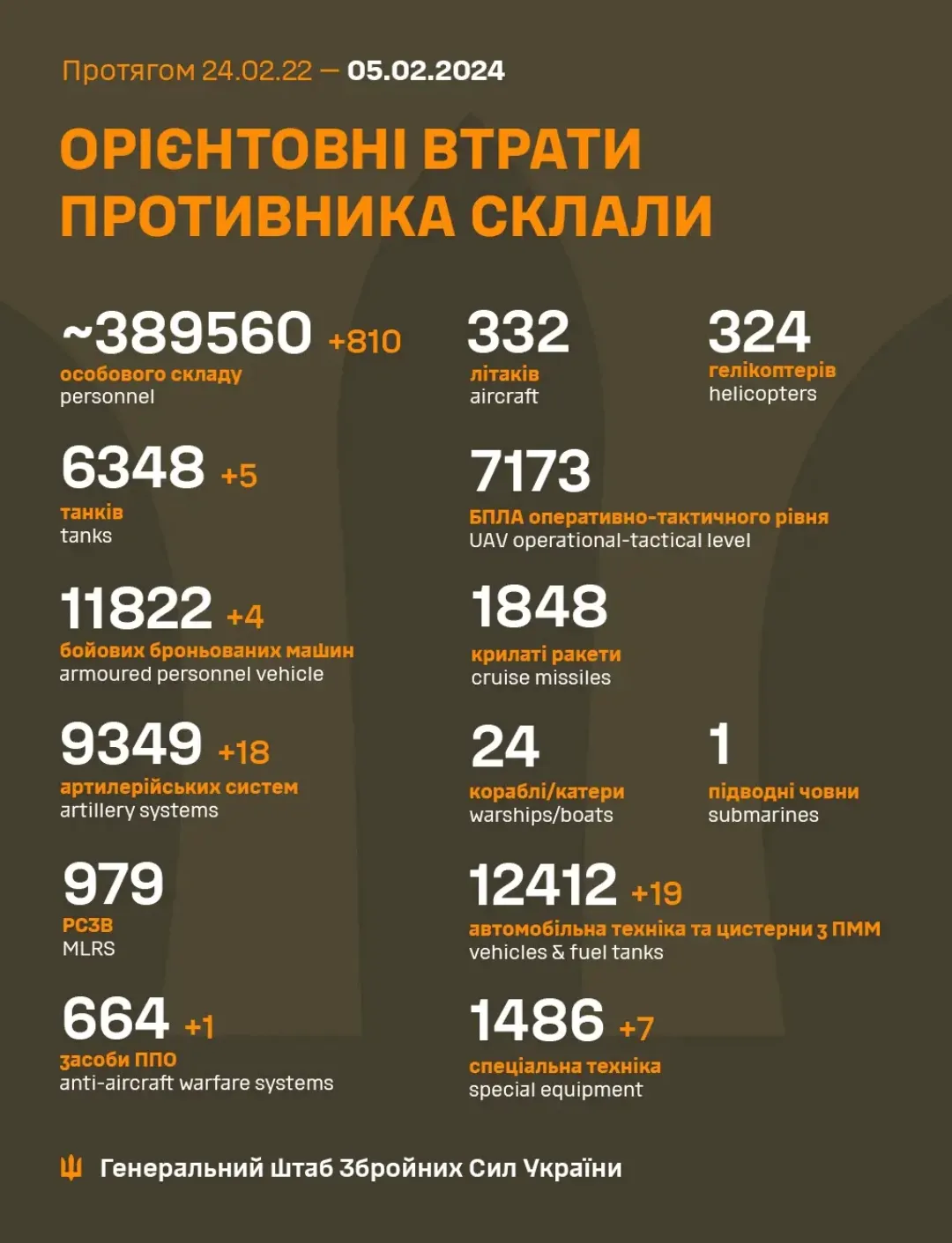 По оперативным сведеньям Генштаба ВСУ, за прошлые сутки – 4 февраля 2024 года было подбито 5 российских танков (с момента полномасштабного вторжения – 6 348 ед.) и 4 ед. бронетехники (всего – 11 822 ед.). Также уничтожено 19 ед. автомобилей и автоцистерн (суммарно – 12 412 ед.) и 7 ед. спецтехники (всего – 1 486 ед.).