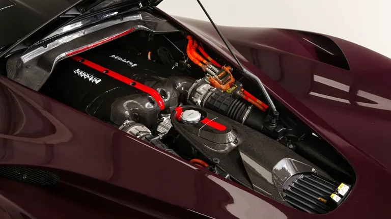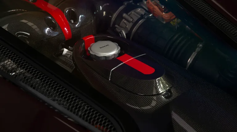 Передний сплиттер, боковые юбки и задний диффузор купе выполнены в атласном черном цвете. Гибридный гиперкар укомплектован пятиспицевыми коваными легкосплавными дисками с отделкой Grigio и черными тормозными суппортами. В списке стандартного оборудования также числится лифт-комплект подвески. Кузов автомобиля покрыт защитной пленкой.