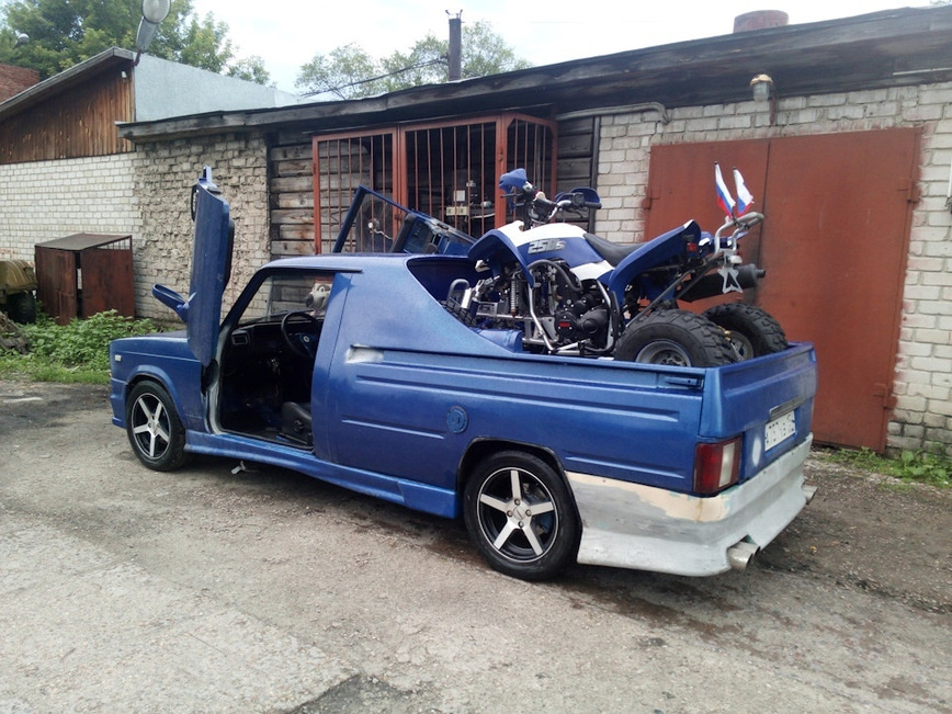 Это подводит нас прямо к ИЖ-27175 (такой себе пикап с лицом ВАЗ-2105), который изображен на фото. Его владелец решил переоборудовать пикап, построенный на агрегатах ВАЗ-2104, для перевозки своего квадроцикла. В итоге получился некий «драндулет», который наверняка заставил вас посмеяться.