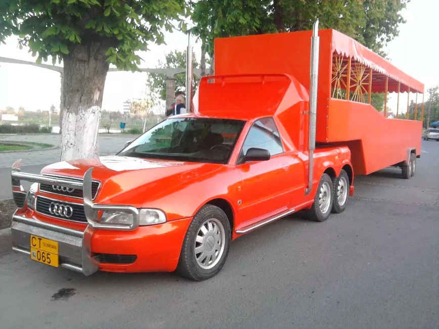 Самое интересное, что шестиколесный Audi A4 оснащен седельно-сцепным устройством и, более того, работает в сцепке с пассажирским прицепом длиной 8 м, в котором могут разместиться до двух десятком пассажиров. Оказывается, весь этот автопоезд был построен для экскурсионных поездок по окрестностям.