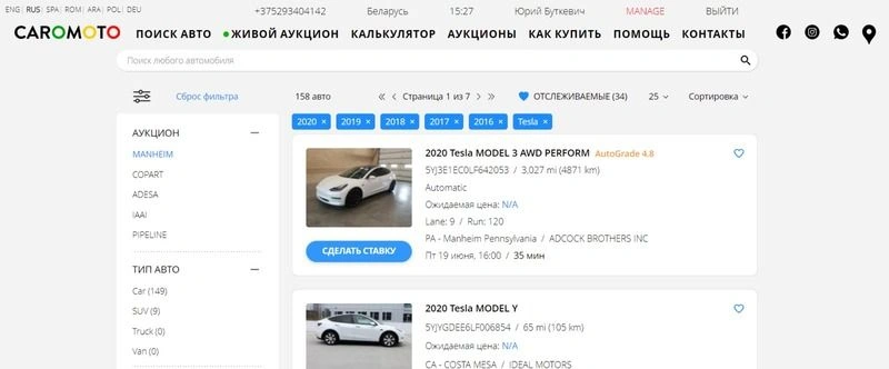 Любой пользователь, даже незарегистрированный, имеет возможность просматривать лоты с аукционов США: Copart, IAAI, Manheim, Adesa, Pipeline