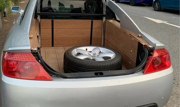 За такую довольно нескромную сумму он убрал боковые окна и превратил задние стойки в опоры крыши. Получившуюся багажную платформу он выстелил деревом. Так же в наборе предусмотрен специальный тент. Родная крышка багажника тоже уцелела. Ее продавец отдает вместе с автомобилем.