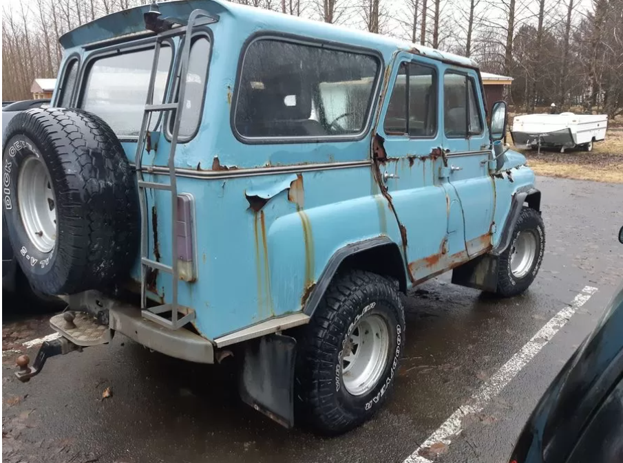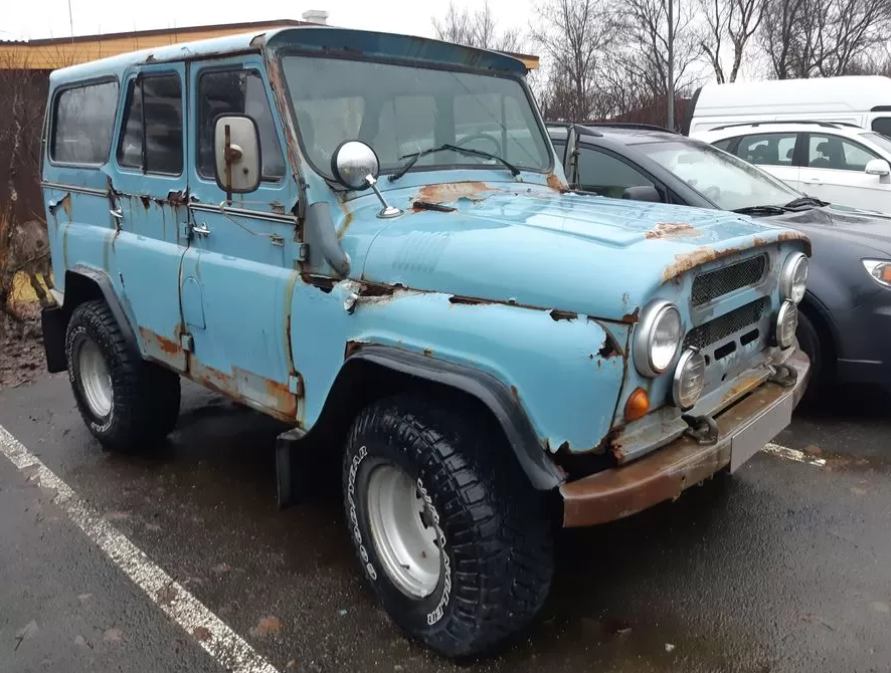 Да, внедорожник сейчас не в лучшей форме. Вероятно, это самый ржавый УАЗ в мире – краска на очагах коррозии просто повисла лохмотьями. При этом колеса новые, с целым протектором. Это говорит о том, что машина полностью на ходу и до сих пор используется владельцем.