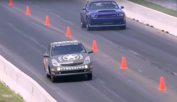 Драгрейсинг Приуса и Dodge Challenger с внезапным финалом (видео)