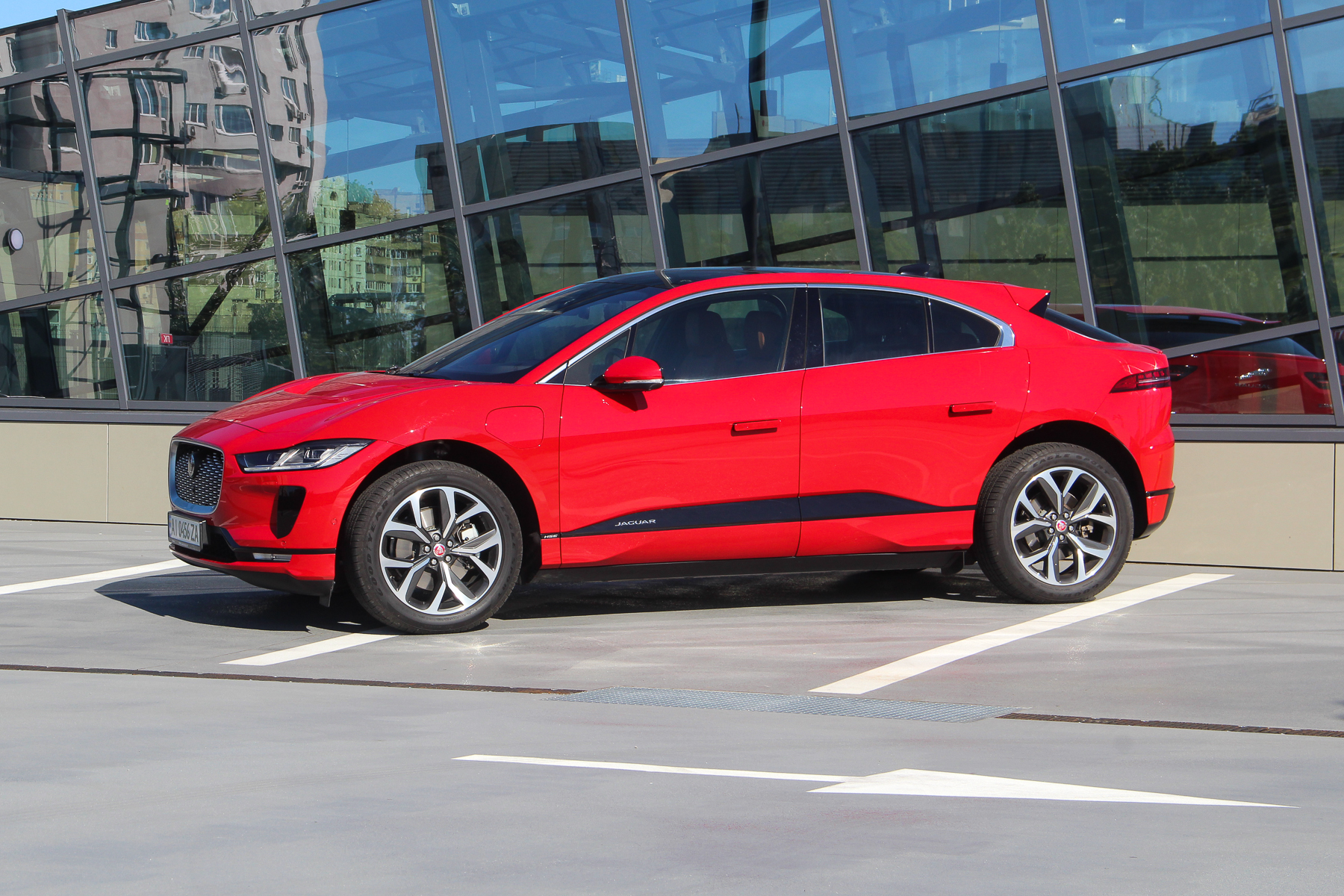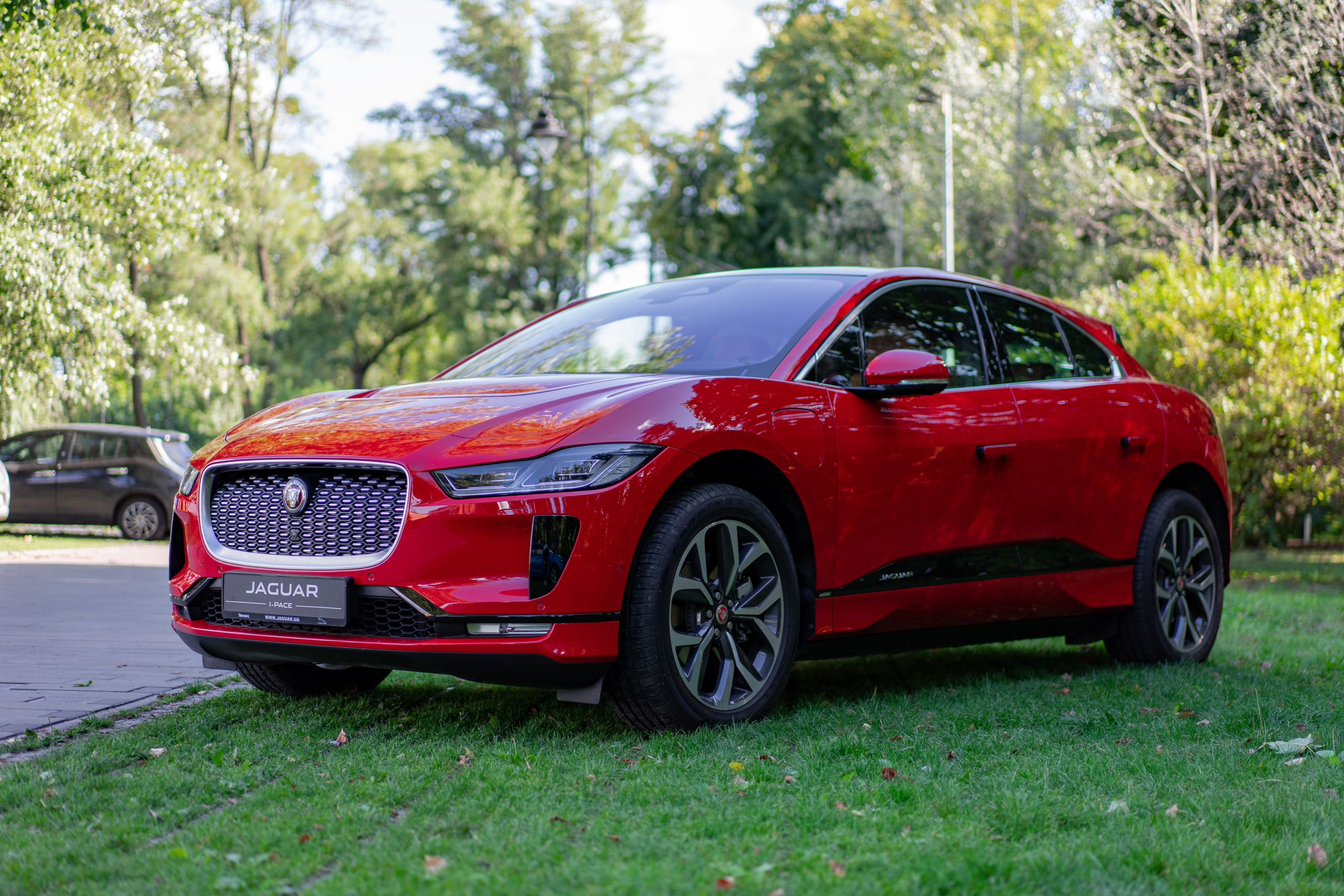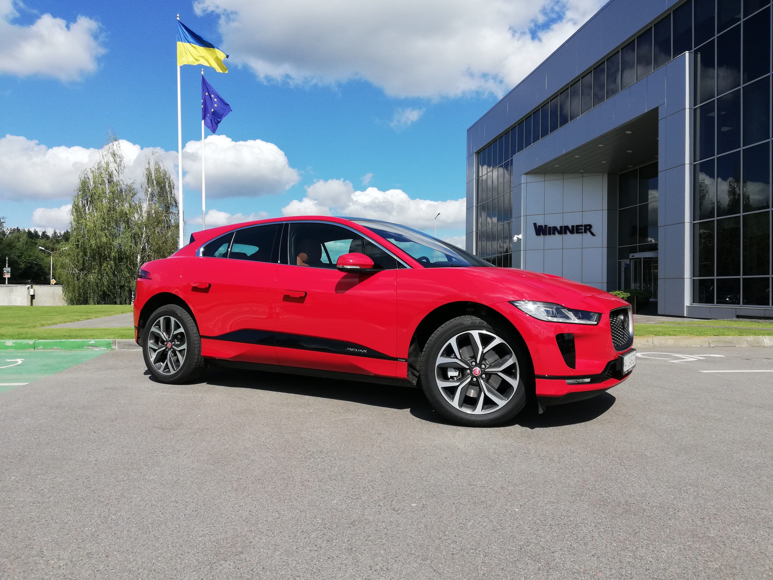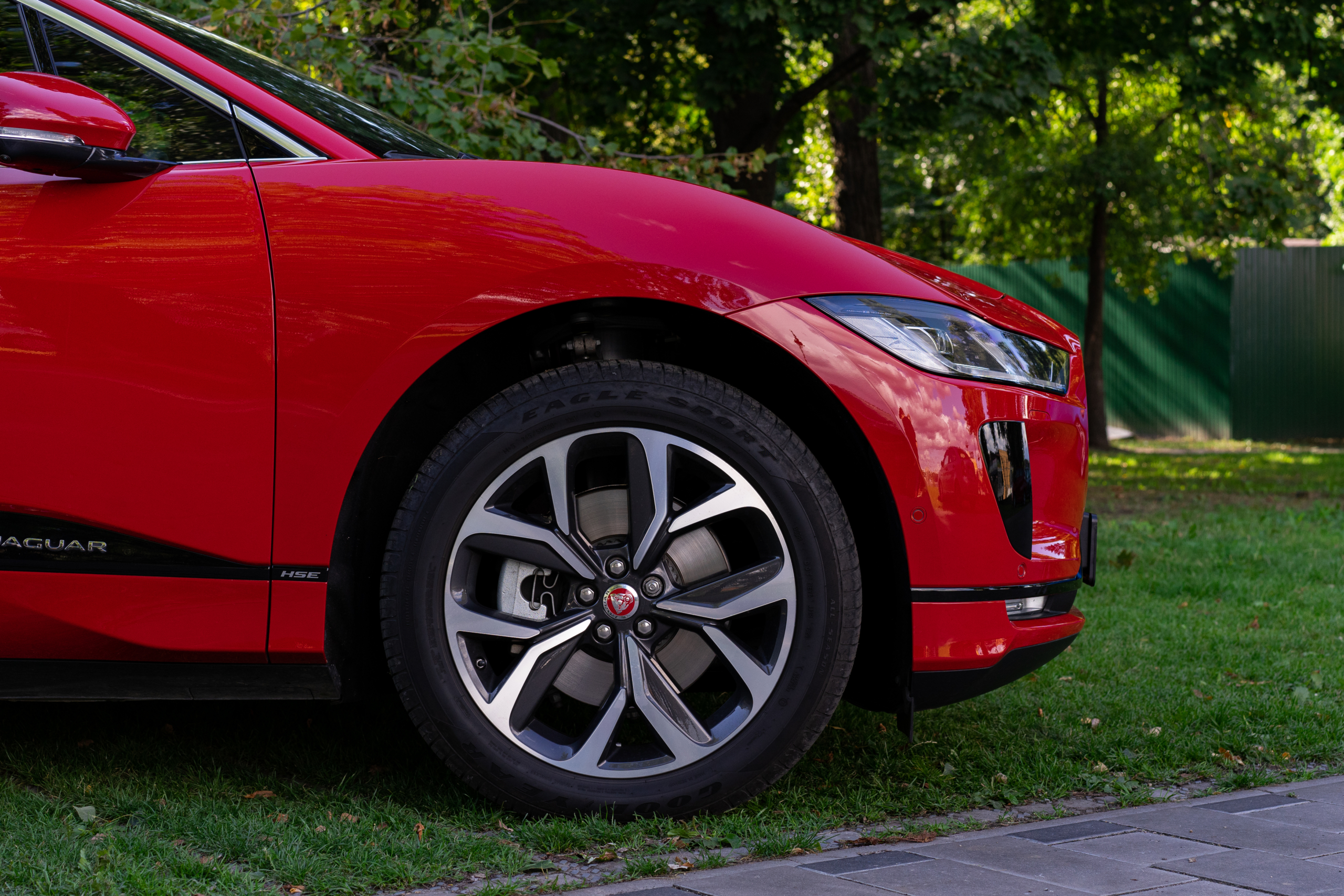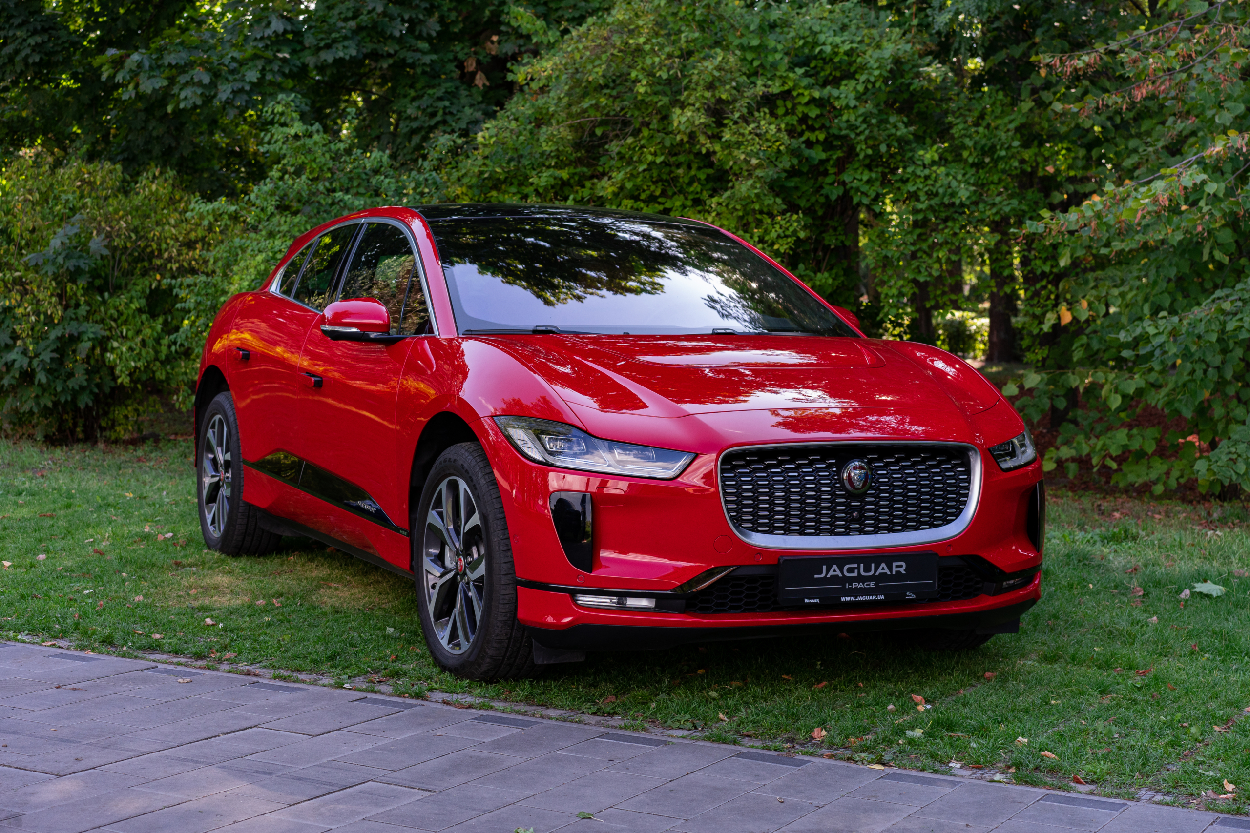 Рестайлінговий Jaguar I-Pace зустрічав мене яскраво в прямому сенсі цього слова — в насиченому червоному кольорі. Відповідь на запитання, чому демо-автомобіль замовили саме червоним (а I-Pace в ньому має доволі грайливий вигляд) я отримав досить швидко. Електромобіль отримав оновлену палітру кольорів, серед яких і цей Caldera Red.