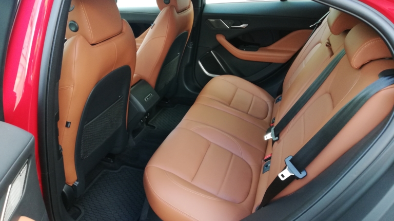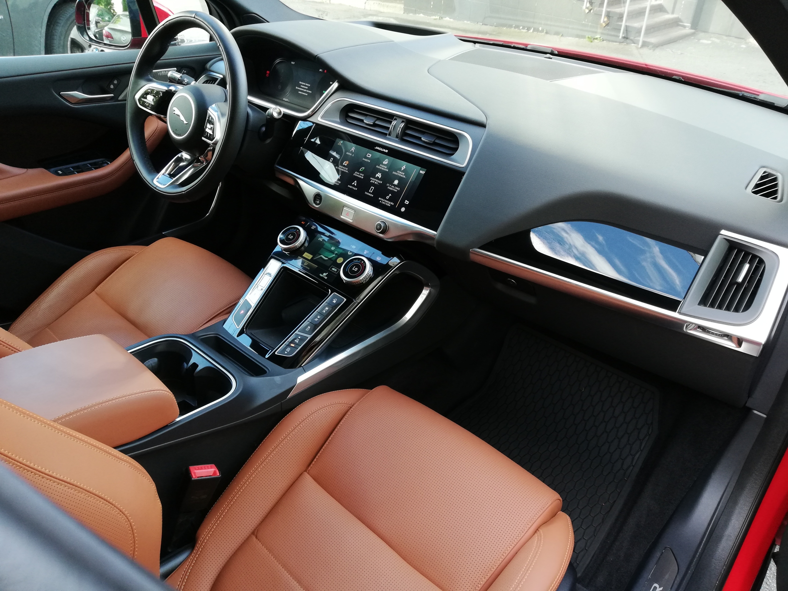 Тестовий Jaguar I-Pace — це версія HSE, доповнена деякими опціями. Наприклад, пакет для холодного клімату з обігрівом лобового скла і кермового колеса, повністю скляний дах (стандартно йде сталевий), Пневмопідвіска. Ці опції і деякі інші, так би мовити “по дрібниці”, підняли прайс електромобіля з 69 тис.євро, до 85 тисяч євро. Звичайно, це лише дещиця опцій, і повний їх список набагато більший. Та й інтер’єр можна підібрати на свій смак: хочете більш спортивний, з карбоновими вставками і сидіннями з цілісною спинкою (майже ковші!), а можна, як у тестовій машині — ошатне коричневе шкіряне оздоблення і побільше чорного лаку у вставках.