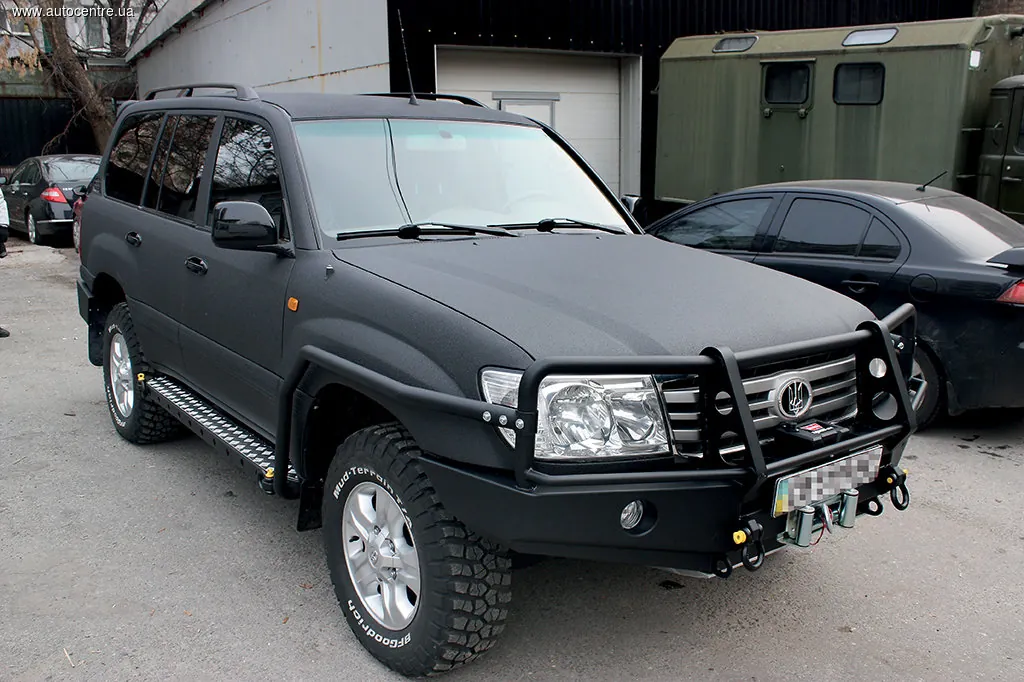 Экстерьер. Самое интересное здесь – полимерное покрытие кузова Line-X, нанесенное методом распыления прямо на заводскую краску. Слой застывшего полиуретана надежно защищает машину от царапин и ударов камнями, к тому же матовое фактурное покрытие не бликует, повышая маскировочные свойства транспортного средства. Кроме того, «сотка» получила стальные силовые бамперы, передний из которых несет электролебедку Warn и защитный отбойник из труб. Пороги из стального профиля и с нескользким покрытием служат одновременно защитой на бездорожье и подмогой при посадке в салон. На них же крепятся проушины, которые помогут вызволить машину из плена бездорожья. Снизу-спереди моторный отсек прикрыт экраном из 8-миллиметрового листа алюминия.