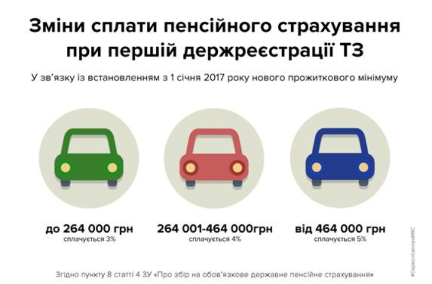 Оскільки з 1 січня прожитковий мінімум зріс до 1600 гривень, то змінено ставки збору на обов’язкове пенсійне страхування під час першої реєстрації транспортного засобу. Про це повідомляє урядовий портал.