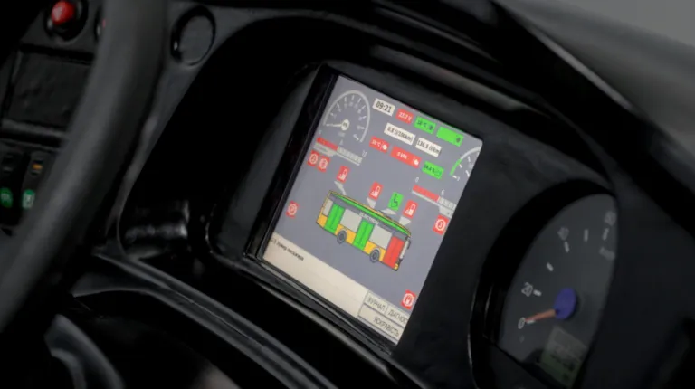 Що стосується безпеки, то автобус оснащено гальмівною системою з електронним управлінням EBS, включаючи системи ABS і ASR. Гальмівні механізми – дискові. Бортовий комп’ютер з сенсорними екранами, за допомогою СAN- шини дозволяє оперативно контролювати роботу і проводити діагностику найважливіших систем. Важливо, що деталі салону, в тому числі обшивка крісел виконані з негорючих матеріалів.