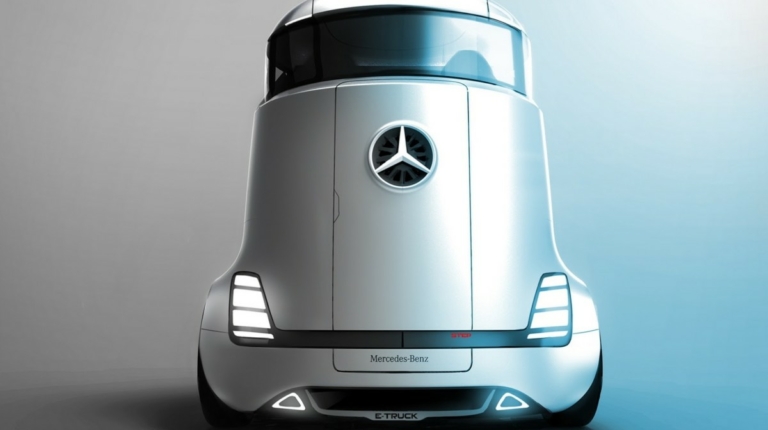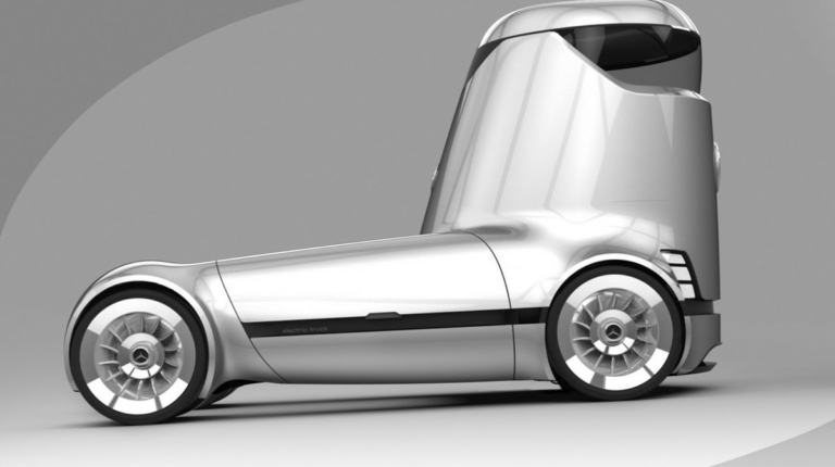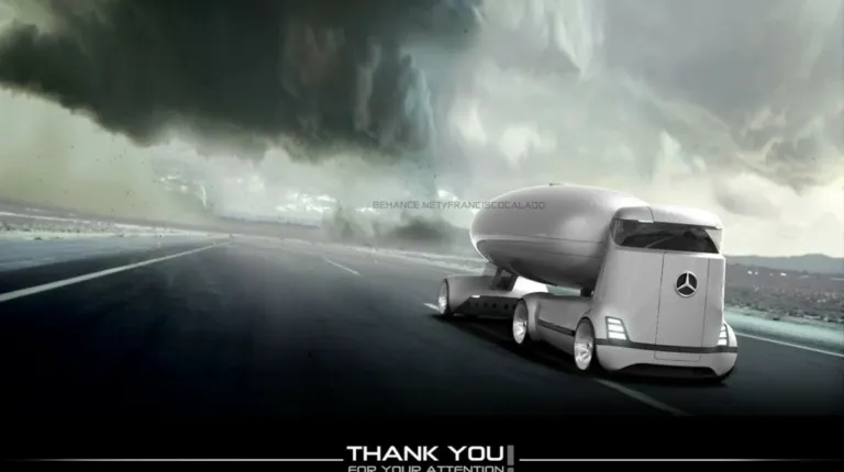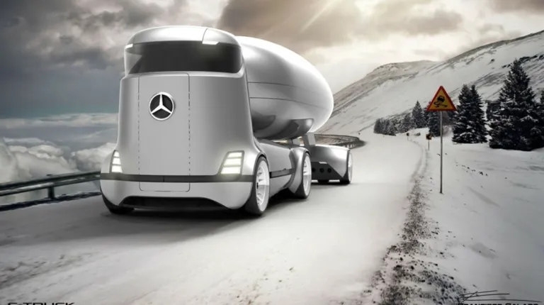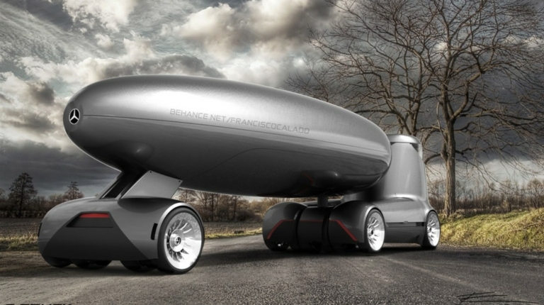 Багатьом хотілося б зазирнути в майбутнє, особливо подивитися на те, який вигляд матимуть автомобілі, наприклад, років через 20. Португальський дизайнер Франциско Каладо вирішив втілити цю мрію і намалював магістральний тягач Mercedes-Benz E-Truck. Більше того, вийшов цілий автопоїзд із напівпричепом-цистерною. Наголос було зроблено на аеродинаміку, щоб зменшити коефіцієнт Сх і таким чином поліпшити економічність. І не випадково і тягач, і цистерна мають сильно округлені форми. Цистерна взагалі нагадує дирижабль.