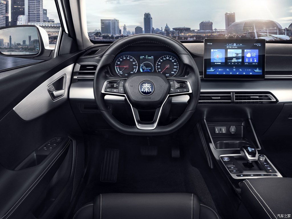 За движение BYD Qin EV отвечает мотор мощность 136 л.с., питает он батарею ёмкостью 54 кВтч, её хватает на пробег в 421 км. Правда, это по устаревшему циклу NEDC, то есть в реальности можно рассчитывать в лучшем случае на 350 км. Зато в салоне есть большой планшет.