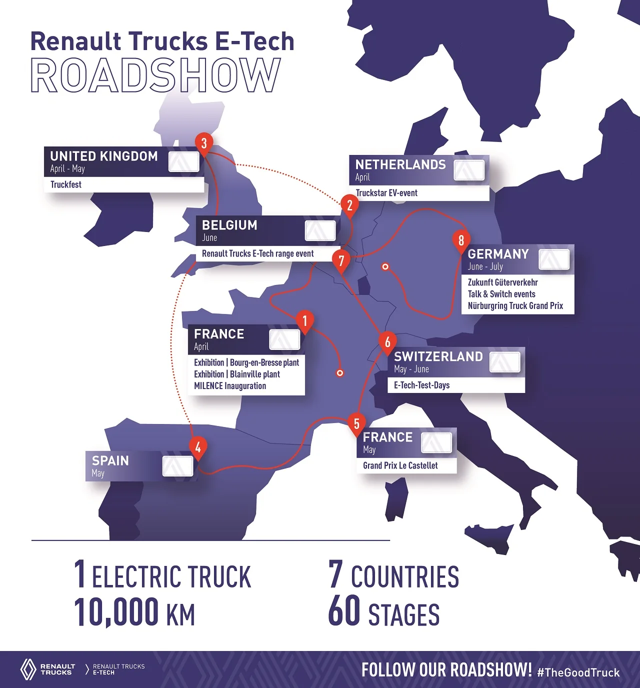 На маршруті протяжністю 10 000 км дорогами 7 країн (Франція, Швейцарія, Німеччина, Нідерланди, Бельгія, Великобританія, Іспанія) заплановано 60 етапів. На кожному з них професіонали транспортної галузі зможуть ознайомитися з перевагою електричної мобільності від Renault Trucks. Зазначимо, що компанія пропонує сьогодні повну лінійку комерційних автомобілів на електротязі – від вантажного велосипеда масою 650 кг до будівельних самоскидів та тягачів для роботи у складі 44-тонних автопоїздів.