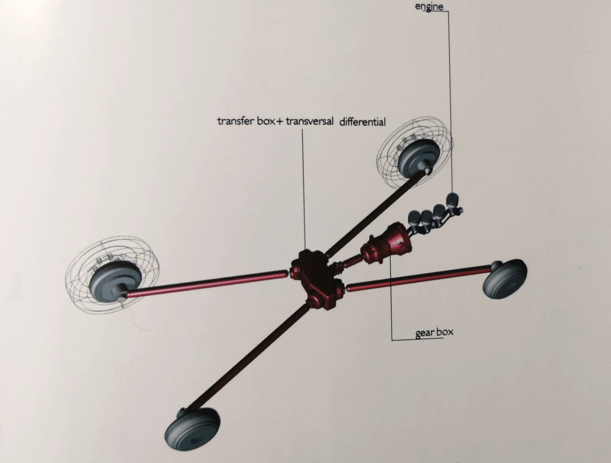 Цей повнопривідний автомобіль мав рідкісну так звану Х-подібну трансмісію. Коробка передач розташовувалась не біля двигуна, а в самому центрі шасі. До неї примикали з обох боків дві роздавальні коробки і від них до кожного колеса йшов свій «персональний» карданний вал.