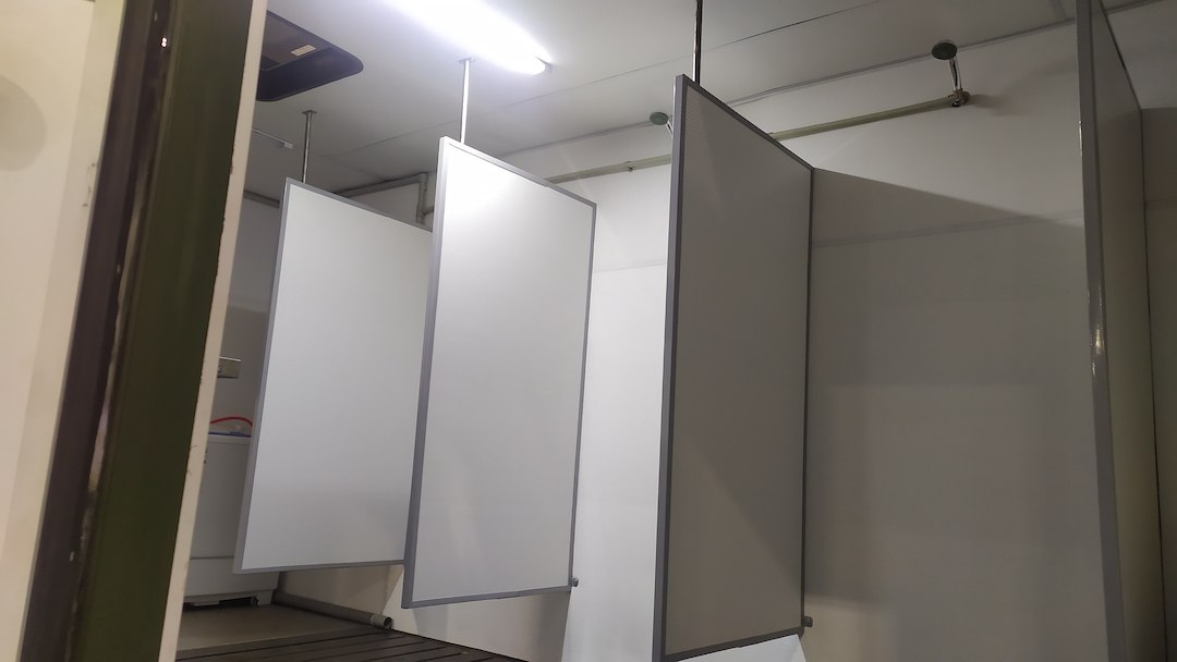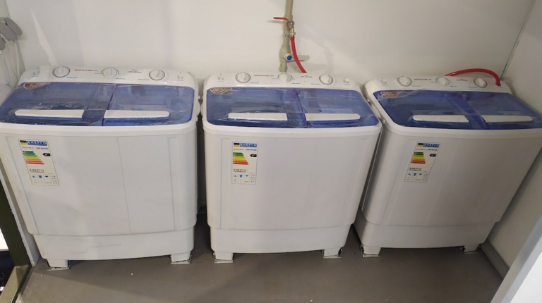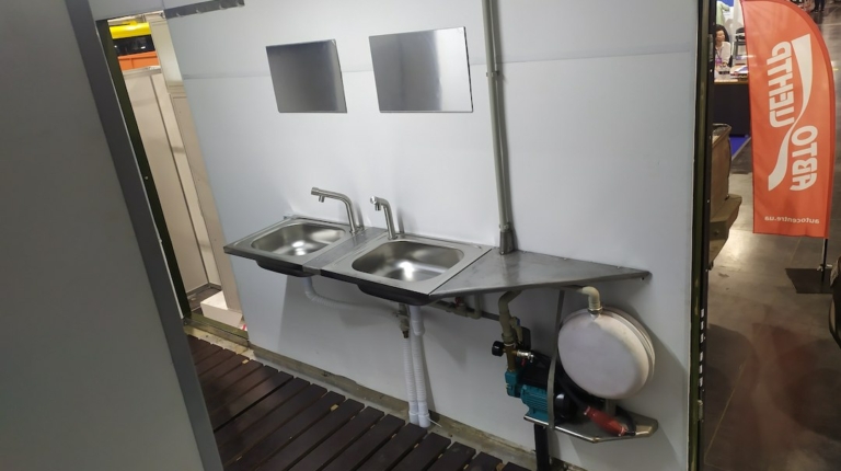 Поруч розташувався ще один корисний проект – банно-пральний комплекс на базі причепу. Це зручний мобільний комплекс, що обладнано трьома пральними машинами, трьома душовими кабінами, та двома умивальниками.