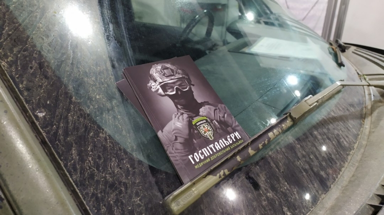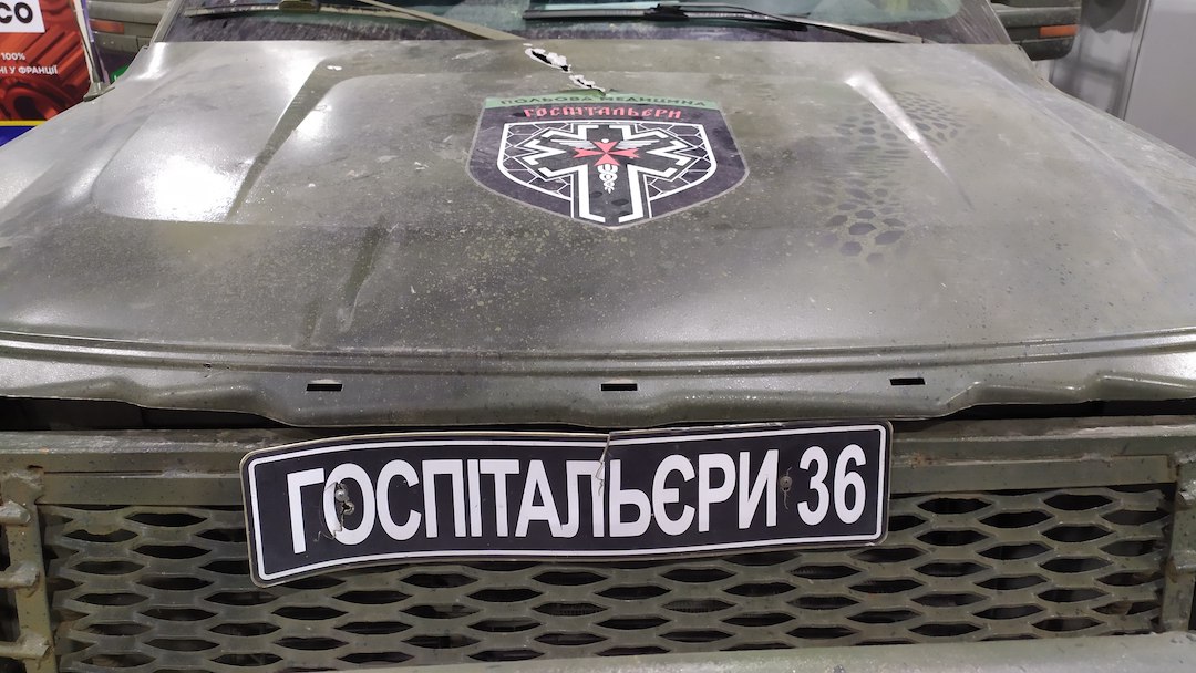 Та повернемось до самих Госпітальєрів. Сміливі та самовіддані хлопці та дівчата з цього батальйону трудяться в найгарячіших ділянках фронту, рятуючи поранених. Одним з прикладів став і герой нашого стенду – великий Ford. На моє питання, куди ж поділось бокове та заднє скло, один з хлопців спокійно розповів, що потрапив в цій машині біля Песків під танковий обстріл. А скло вибили уламки мосту, які полетіли від потрапляння снаряду. Осколки прошили двері в правій частині авто, а один з них потрапив би в ногу водію, та його врятував… паспорт України. Уламок застряг в сторінках.
