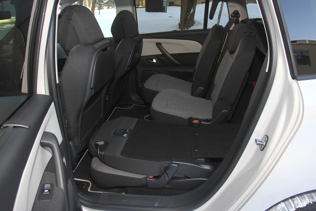 Чи доцільно було робити різний дизайн для двох версій одного автомобіля? І хто має переконливіший вигляд – просто C4 Picasso чи Grand C4 Picasso? До оновлених моделей таких запитань не виникає: тепер в анфас обидві версії здаються абсолютно однаковими. А от задні ліхтарі різні – але це вже інша історія, все-таки форма кузова суттєво відрізняється. Особисто мені більше імпонує саме Grand: він трохи масивніший, серйозніший, більш чоловічий. Та й задні ліхтарі у нього симпатичніші. Тому для знайомства з оновленим Picasso я обрав саме версію Grand. Хоча, чесно кажучи, спочатку навіть запідозрив підступ: автомобіль за визначенням семимісний, а в моєму – п’ять крісел! Повноцінних, фактично відокремлених, – але п’ять! Щось не так. Помахом ноги відчиняю багажник – і одразу перевіряю, чи вийде зворотна дія. Працює! А це дуже важливо. Зручно буде не тільки вантажити, а й розвантажувати автомобіль. Шкода, що цю логіку освоїли не всі виробники. У багажнику – доволі важкий масивний гумовий килимок… А під ним добре заховані ще два крісла, які легко «вискакують» за допомогою спеціальної петельки і так само легко складаються. Чесно кажучи, місця якщо не дитячі, то підліткові. Все-таки це сімейний автомобіль. А спробуйте знайти сім’ю з семи дорослих людей. Діти виростають і розлітаються, тож Grand C4 Picasso треба купувати, коли всі в зборі – і діти, і батьки, і бабусі-дідусі.