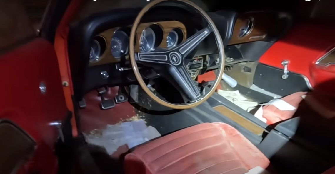 Кузов автомобіля покритий шаром пилу та бруду, за яким ховаються невеликі вогнища іржі. Також є павутиння та сліди присутності гризунів. Останні господарювали в салоні, під капотом та у багажнику Mach 1. При цьому колір шкіри та пластику в кабіні практично не вигорів.