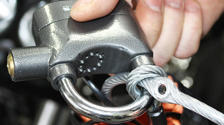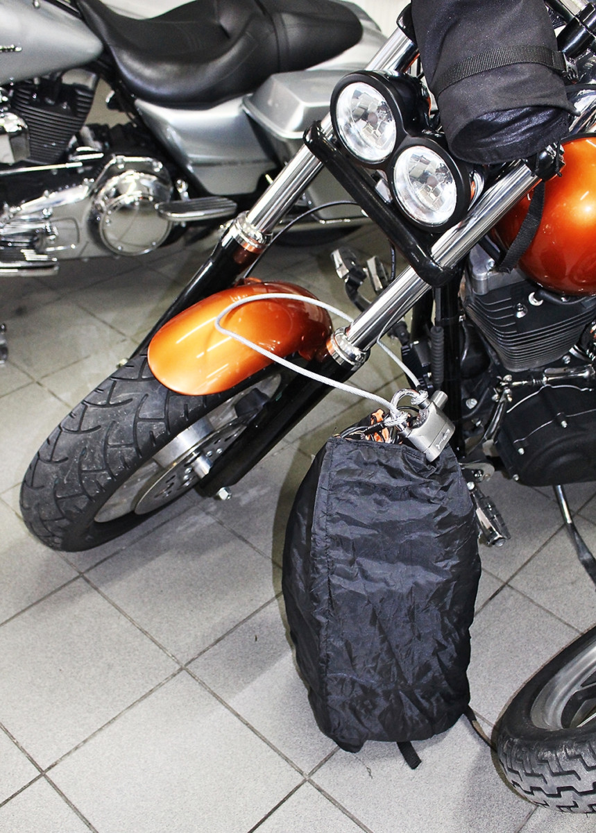 В сумке для хранения шлемов по периметру внутри протянут стальной тросс, а также есть уникальный замок со звуковой сигнализацией. Сила звука в 110 дБ дает громкий сигнал владельцу и окружающим о вероятном взломе.