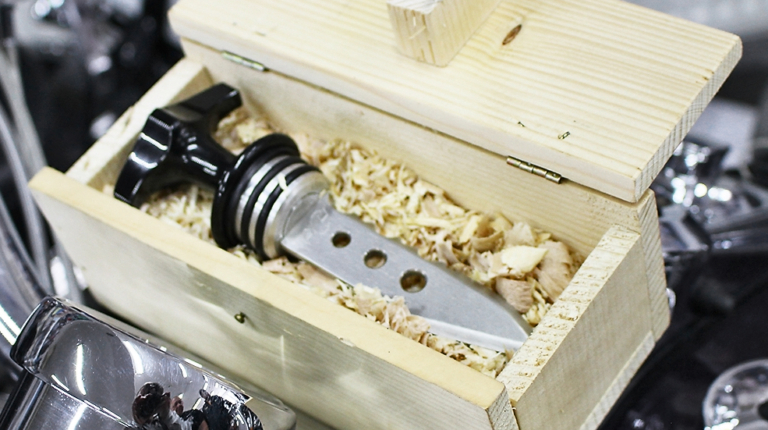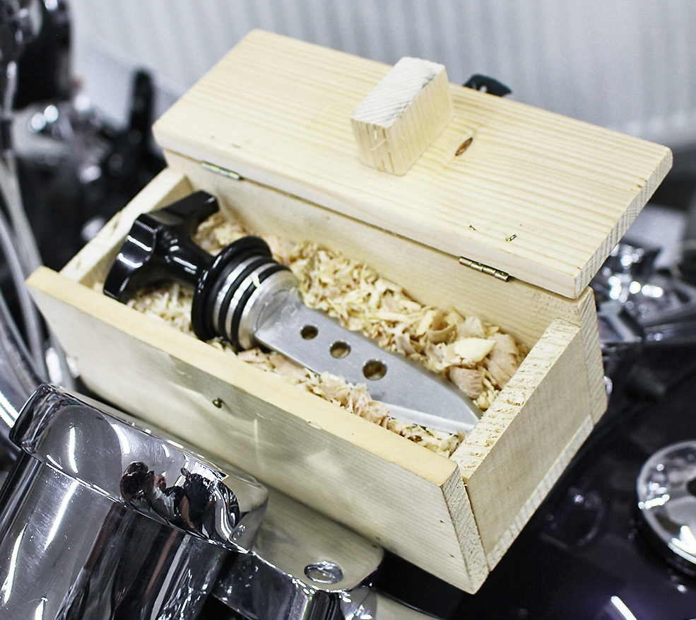 Нож, замаскированный под масляный щуп, выполняет две функции одновременно: самозащиты и проверки уровня масла в двигателе (на лезвии ножа нанесены соответствующие метки).