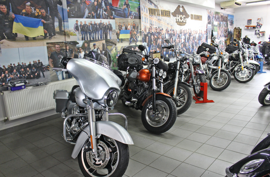 Помимо широчайшего выбора мотоциклов, в мотосалоне также представлена экипировка мотоциклистов – куртки, шлемы и всевозможные аксессуары, включая сумки, противоугонные системы и элементы тюнинга. По соседству с мотосалоном находится станция техобслуживания «Харли» с полным ассортиментом приспособлений и редких в Украине дюймовых ключей.