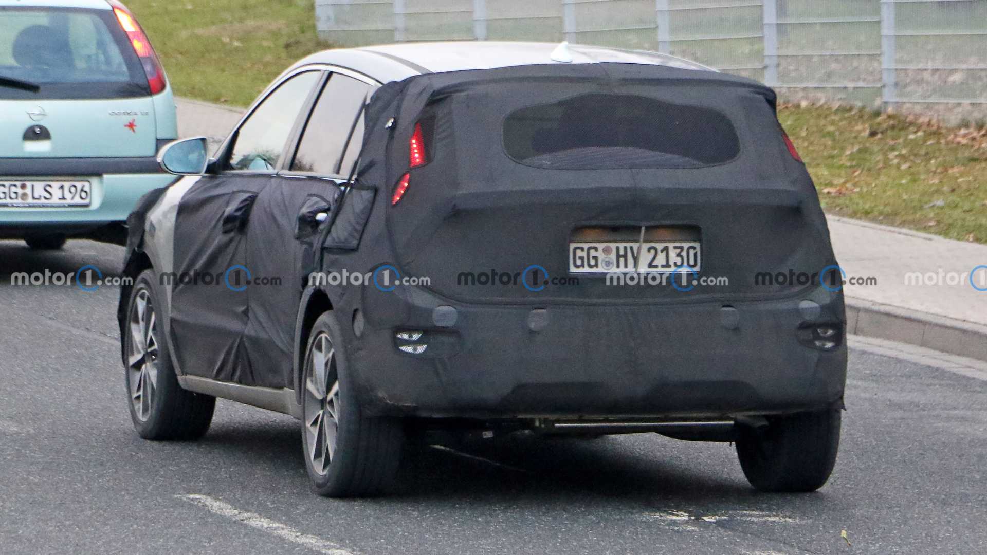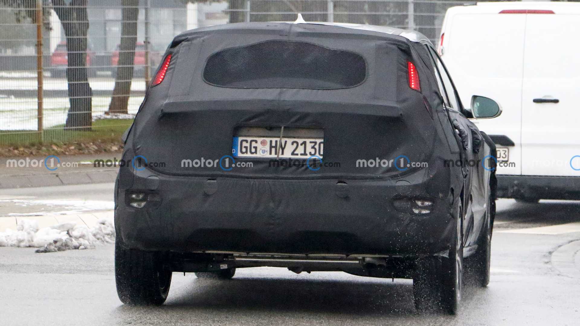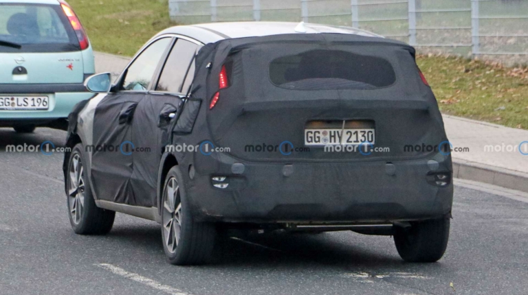 Передня і задня частини автомобіля щедро прикриті камуфляжем. Ймовірно, саме тут і очікуються найбільші зміни. Незважаючи на старання виробника приховати їх, вони яскраво виступають назовні. Особливо добре проглядається “акулячий ніс”. Його ми вже бачили в концепті електромобіля Kia Habaniro, який виробник показував у 2019 році. Отже, прототип дизайну очевидний.