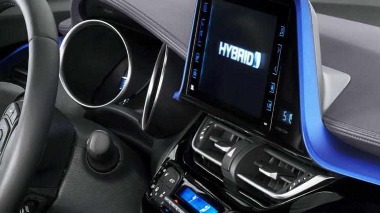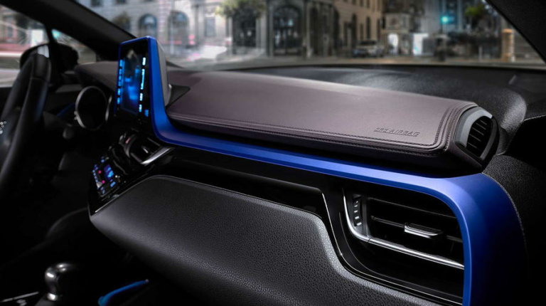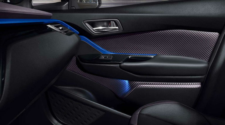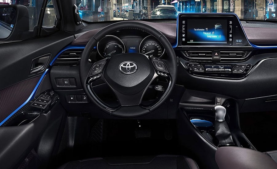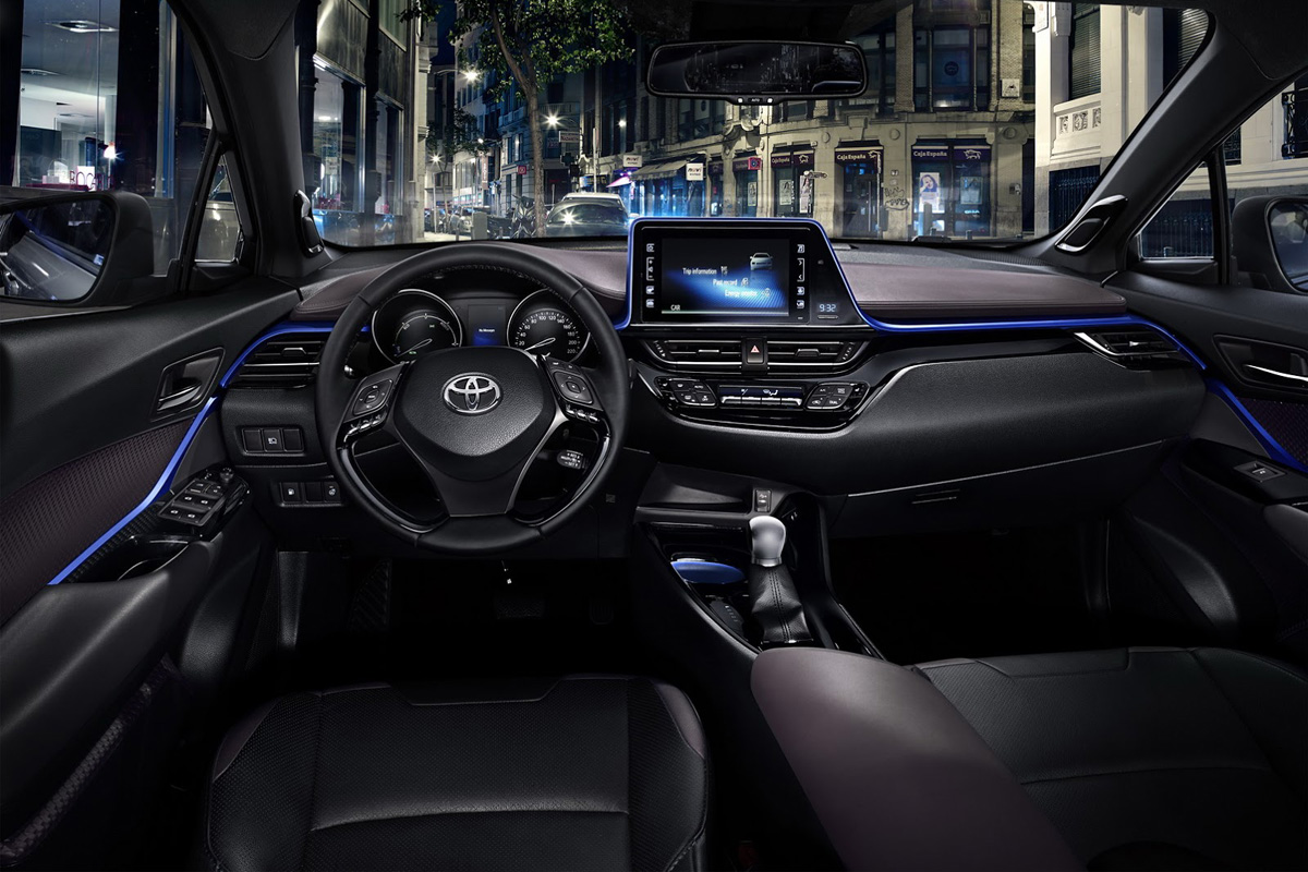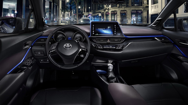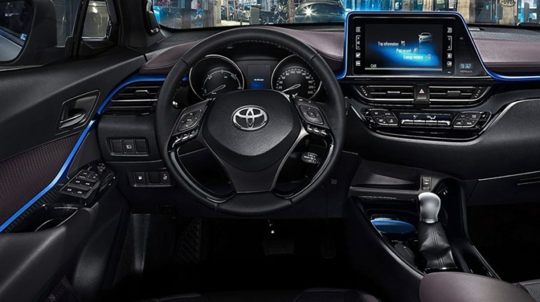 У салоні Тойота також є цікаві рішення. Передня панель розділена яскраво-синьою горизонтальною смугою. Прилади розміщені в окремих колодязях. А 8-дюймовий сенсорний дисплей розташований незвично високо. Передні сидіння розділені високою центральною консоллю.