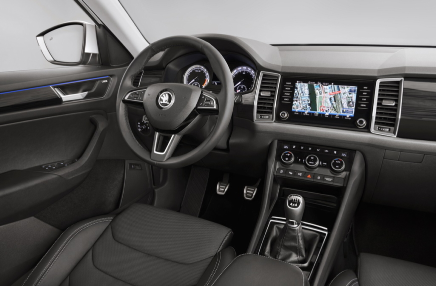 Интерьер Skoda Kodiaq выполнен в классическом стиле, который нашел свое отражение в других моделях чешского бренда. Передняя панель с вертикальными воздуховодами выгладит строго и солидно, как и подобает машине такого класса. Центральным элементом приборной панели является мультимедийная система Skoda Connect. Шкала приборов выполнена в виде двух полноценных дисков тахометра и спидометра, а по центру расположен цифровой дисплей, обеспечивающий водителя всей необходимой информацией.