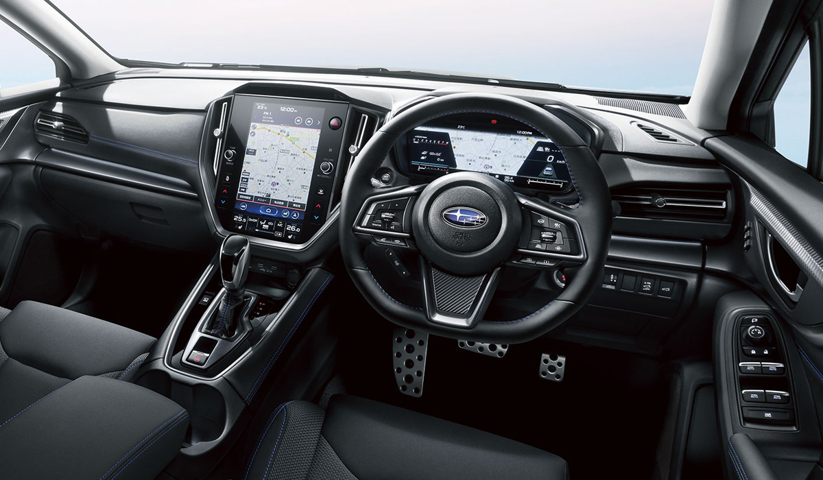 Что касается салона, то в новом поколении он стал более просторным. Из новшеств можно выделить подогрев сидений второго ряда и появление медиасистемы Starlink с 11,6-дюймовым дисплеем. Управлять музыкой, климат-контролем и прочим можно с экрана. Но на всякий случай производитель также сохранил физические клавиши, расположенные по бокам экрана. Также универсал Субару впервые получил виртуальную приборную панель с несколькими режимами отображения информации на дисплее диагональю 12,3 дюймов уже в базовой комплектации.