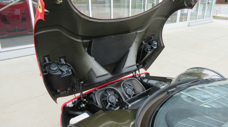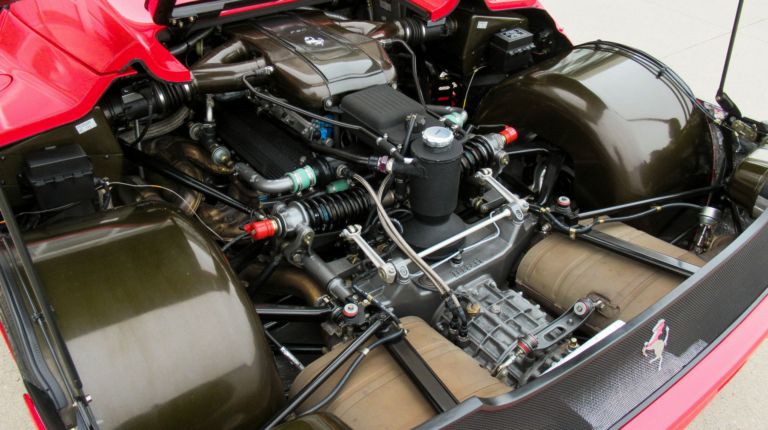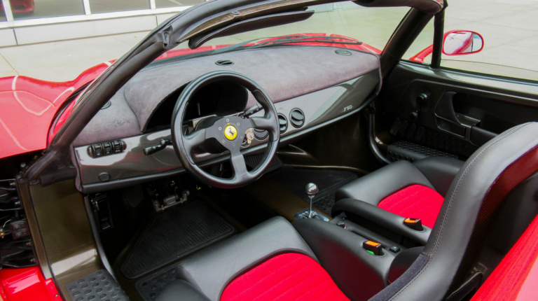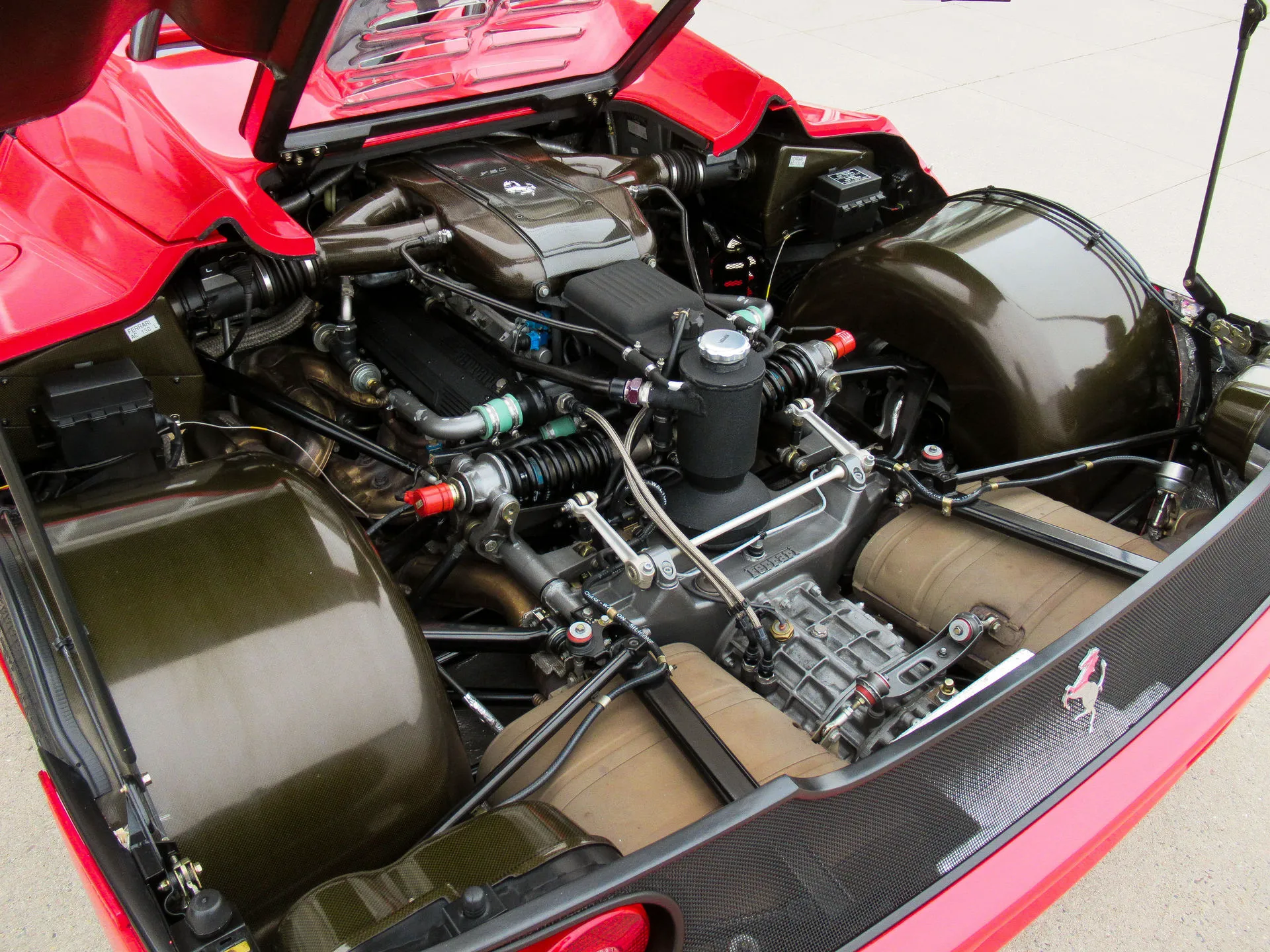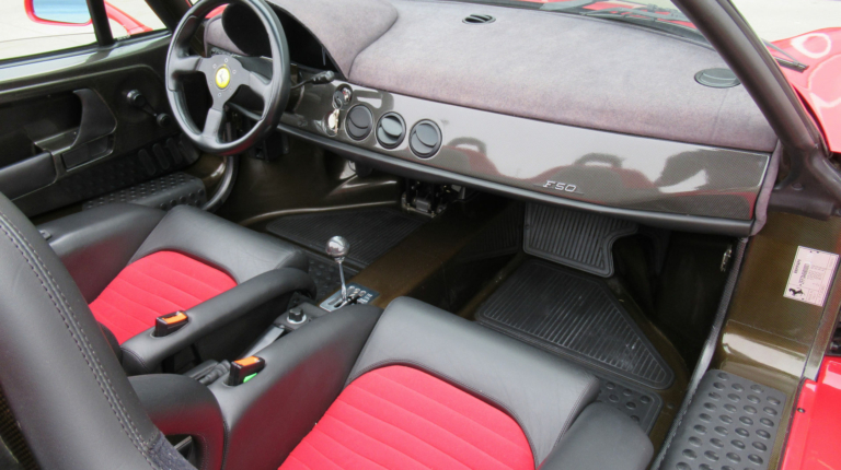 Несмотря на то, что Ferrari F50 жил на два континента, он сохранился в идеальном состоянии и проехал всего 5425 километров. Суперкар оснащен легендарным 4,7-литровым атмосферным двигателем V12 мощностью 512 л.с. и частотой вращения до 8 000 об/мин. Двигатель жестко закреплен в подкапотном пространстве вместе с шестиступенчатой коробкой передач и является частью силовой структуры кузова. Разгон до “сотни” занимает 3,87 секунды, а максимальная скорость ограничена на отметке в 325 км/ч.
