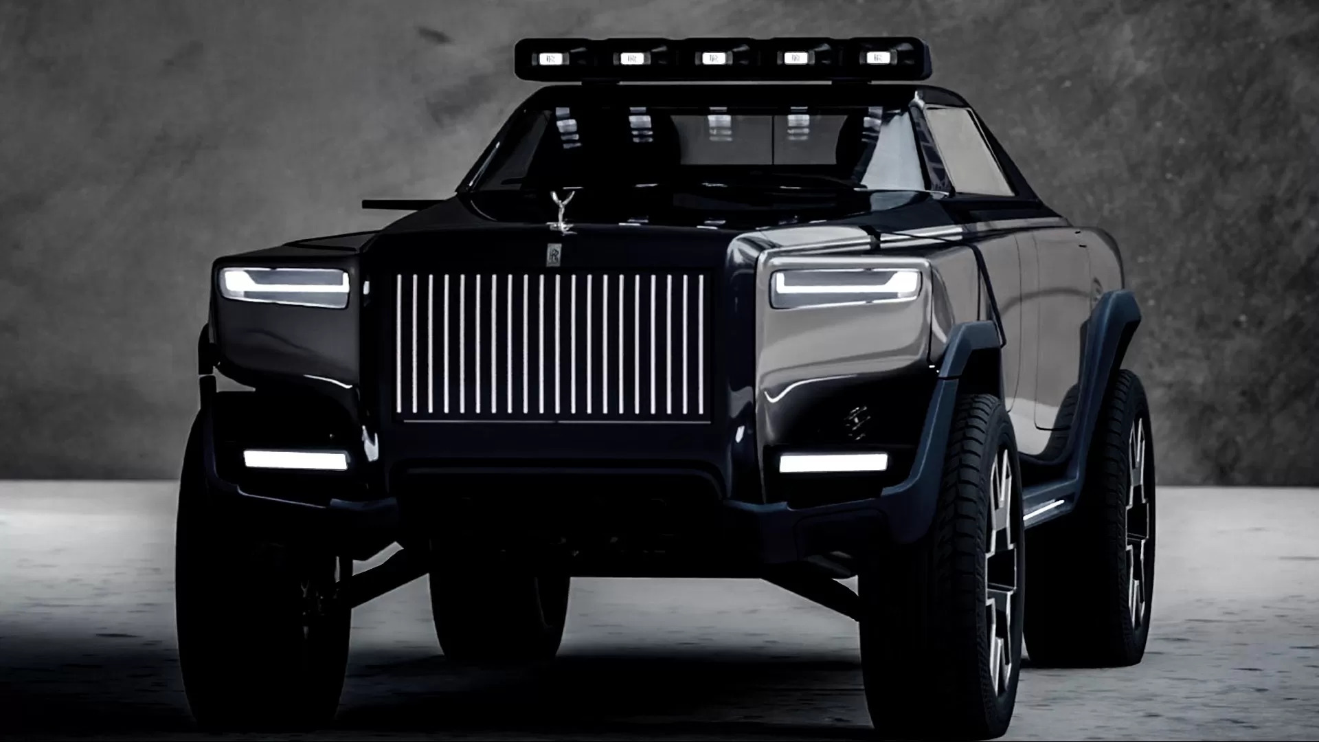 У передній частині — фальшрадіаторна решітка з підсвічуванням, оформлена у добре знайомому фірмовому стилі Rolls-Royce, та легендарна фігурка «Дух екстазу». Над нахиленим назад лобовим склом нависає потужна світлодіодна люстра. Також з підсвічуванням у пікапу дверні пороги.