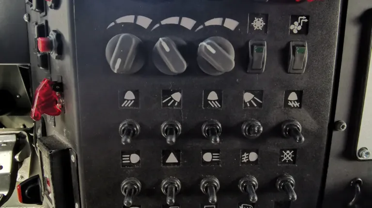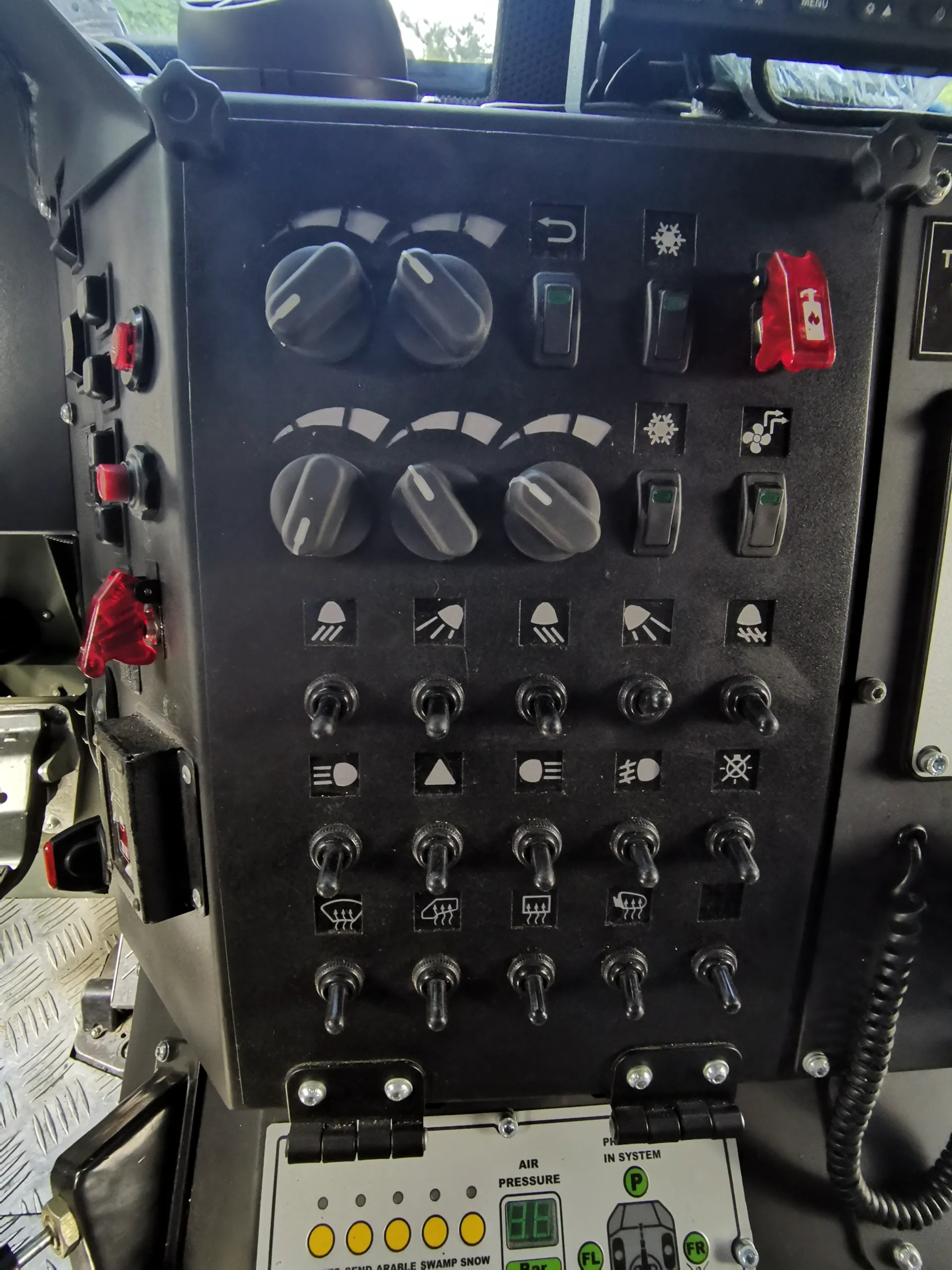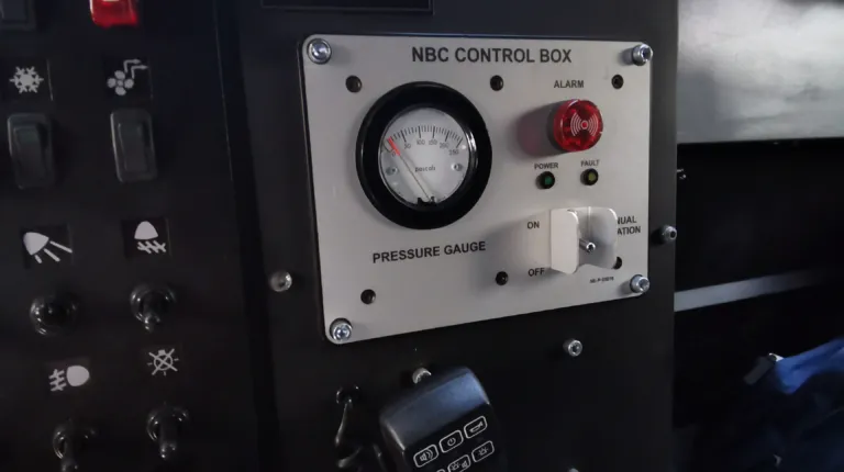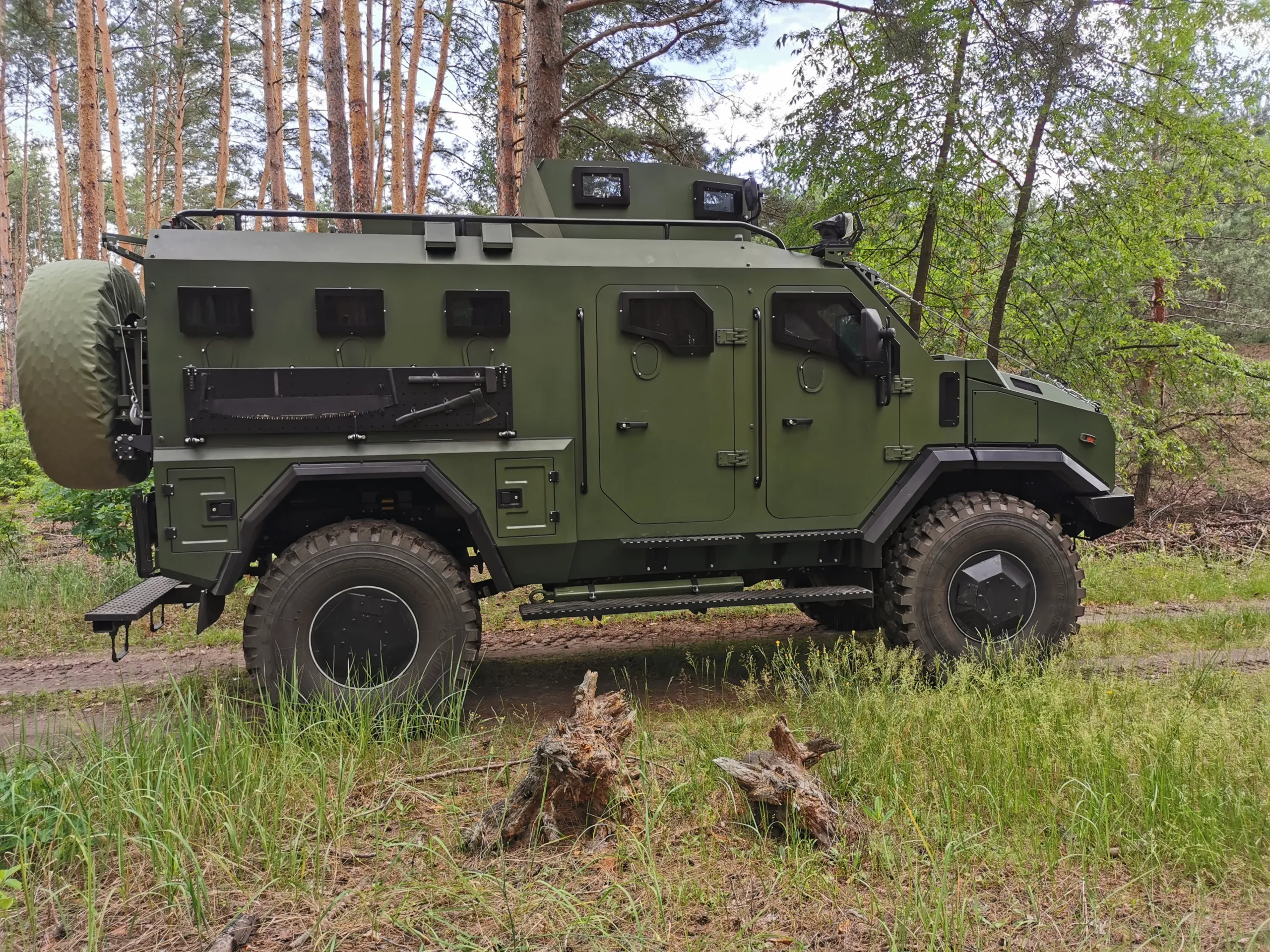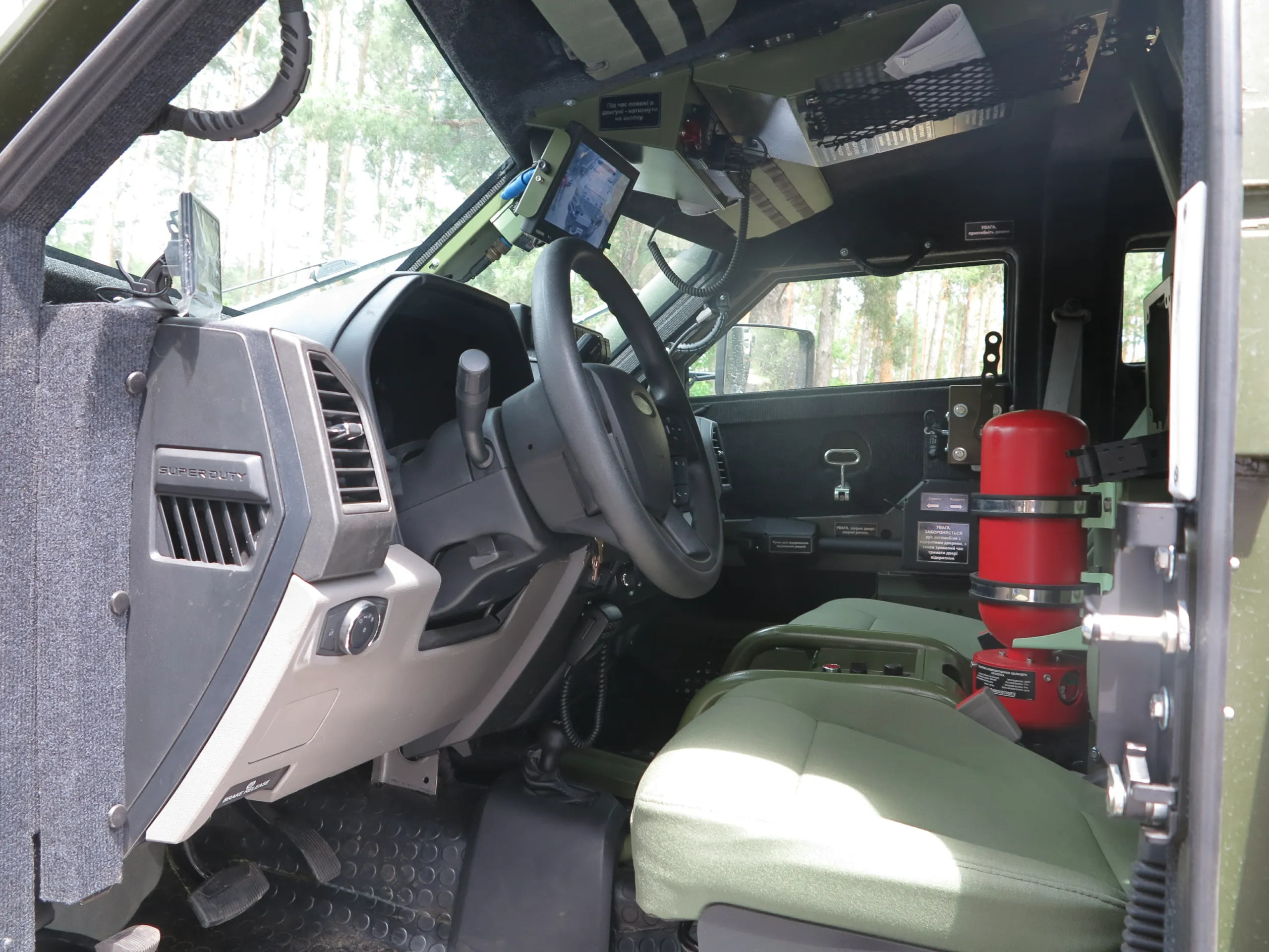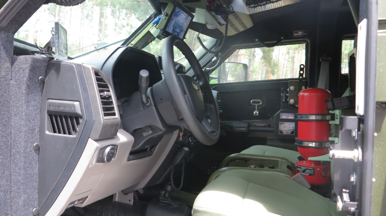В комплектацию бронеавтомобиля входит система автоматического пожаротушения, которая защищает экипаж от смеси «коктейль Молотова» и помогает при попадании РПГ. Также отметим наличие фильтровентиляционной установки и мощной системы климат-контроля, эффектность которой мы оценили при забортной температуре +32С. Машина может комплектоваться тепловизионным комплексом с определением человека на расстоянии до 4 км и автомобиля – до 7 км.