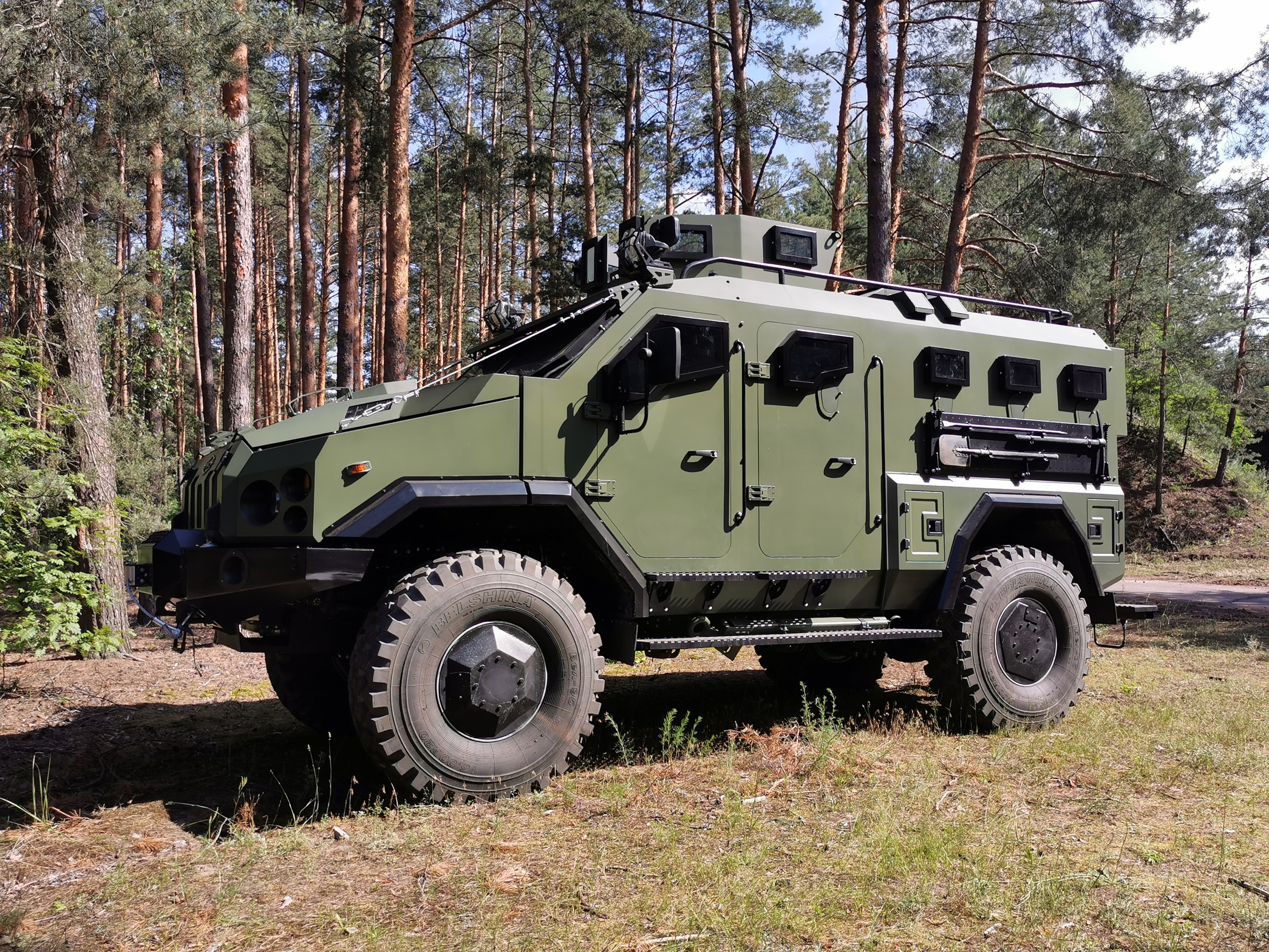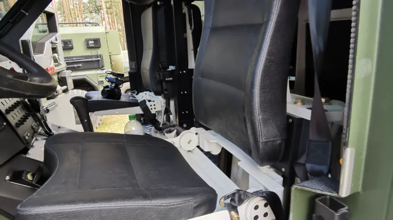 Первым нашим подопытным стал бронеавтомобиль «Варта», построенный на доработанном полноприводном шасси МАЗ-5434 (4х4). Машина полной массой 17,5 т предназначена для перевозки 2+8 человек. Кузов изготовлен из шведской стали марки 560 и обеспечивает класс защиты STANAG 4569 Level 2 – от пули Б3 калибра 7,62 мм. Здесь усиленная противоминная защита – V-образное днище позволяет выдерживать подрыв мощностью до 6 кг в тротиловом эквиваленте. Особо хочется отметить специальные противоминные сиденья по стандарту НАТО, не имеющие жесткой связи с полом и оснащенные 5-точечными ремнями.