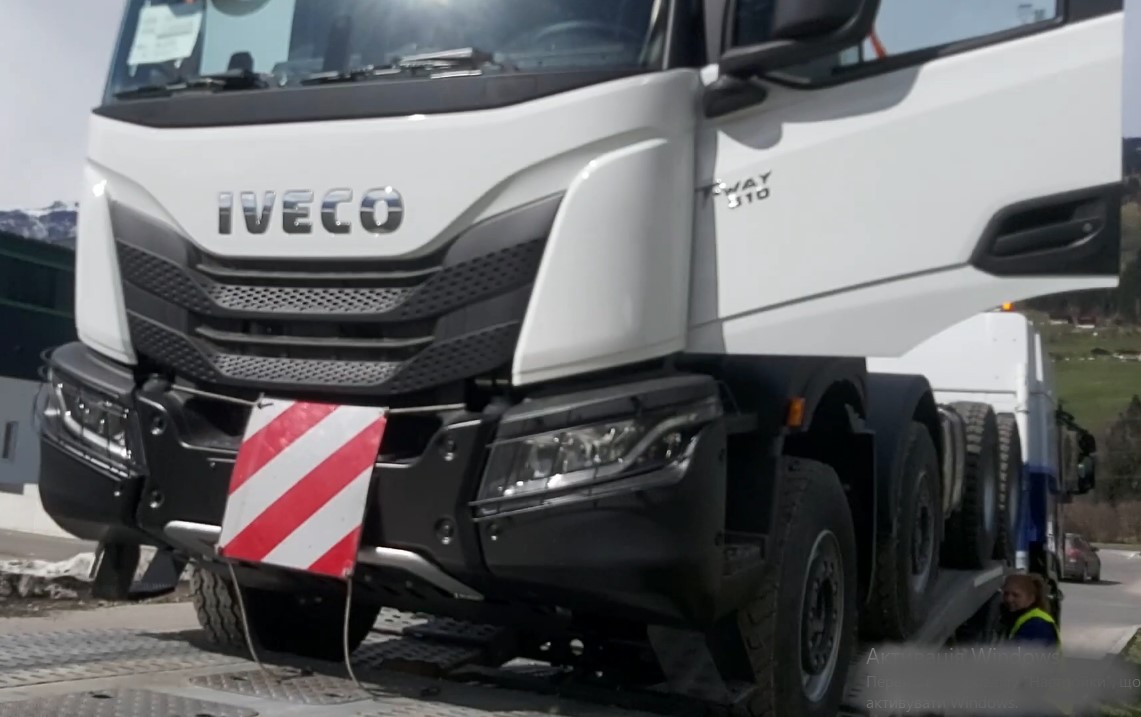 Однако в сеть все же просочились первые изображения IVECO T-Way. Короткое видео было снято во время транспортировки четырехосного шасси на трейлере одним из водителей. О том, что это именно T-Way красноречиво говорит шильдик на открытой двери, по которому видно, что машина оснащена 510-сильным двигателем.