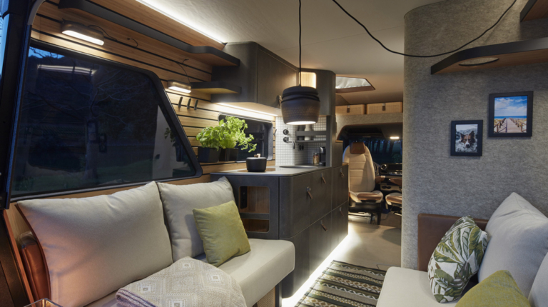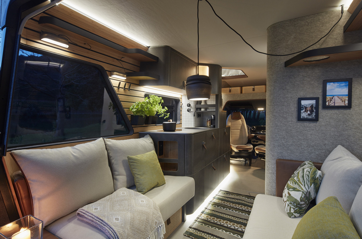 А стосовно планування салону і оснащення, то кемпер майбутнього надає максимум комфорту. Це і модерний кухонний блок, і велика душова кабіна, і розкішна спальня. Одна з родзинок – висувний за допомогою електроприводу мангал.