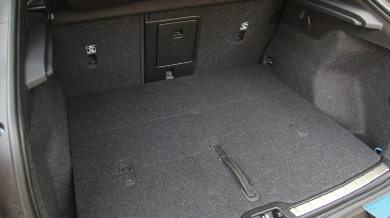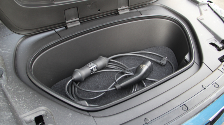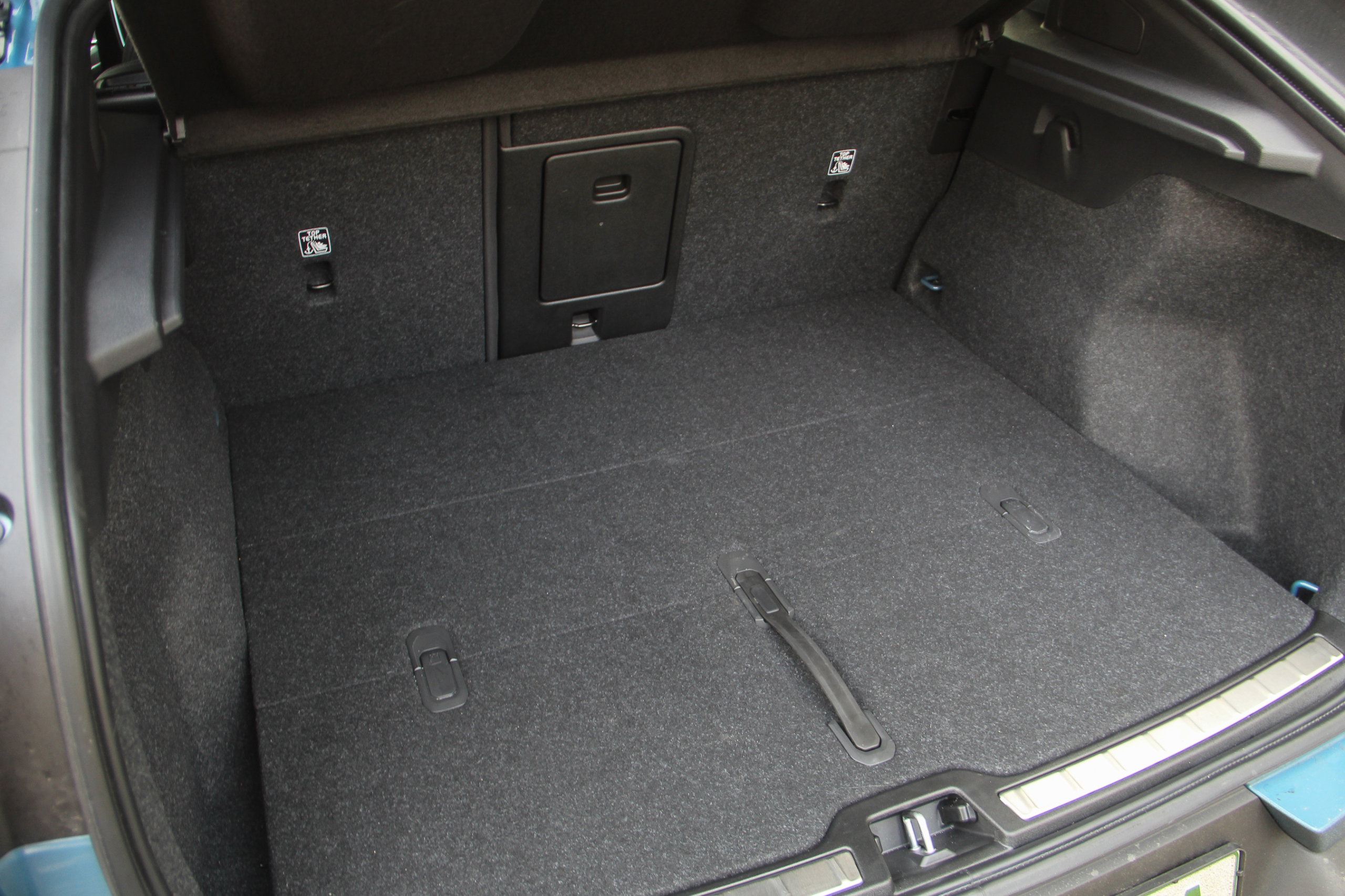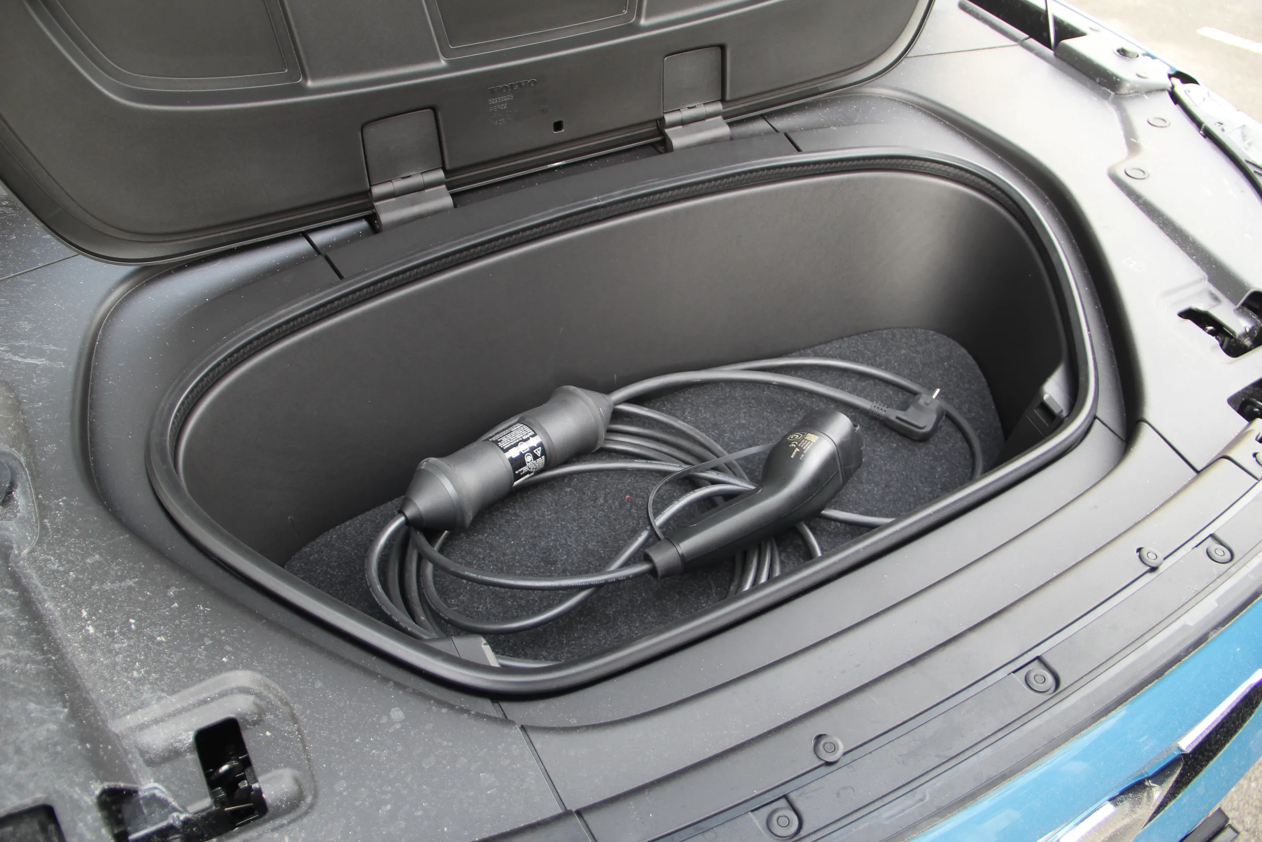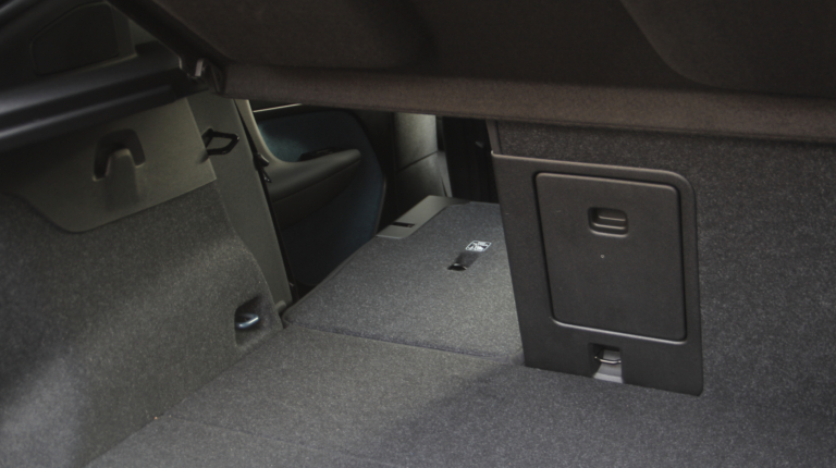 Не ущемлен и багажник. Здесь он даже чуть выше от пола до шторки (а точнее полки), поэтому и объем получился 431 литр. Войлочная обивка, переставляемый и складываемый секционно фальшпол, средних размеров ниша под ним и две небольшие по бортам; складываемые по частям спинки второго ряда и лючок для длинномером – все довольно практично. Да, запаски здесь нет и близко, а ремкомплект следует искать под… капотом. Ведь там есть небольшой багажник-довесок. Это ниша для хранения зарядных кабелей, в которой и прячется набор для временного ремонта проколов.
