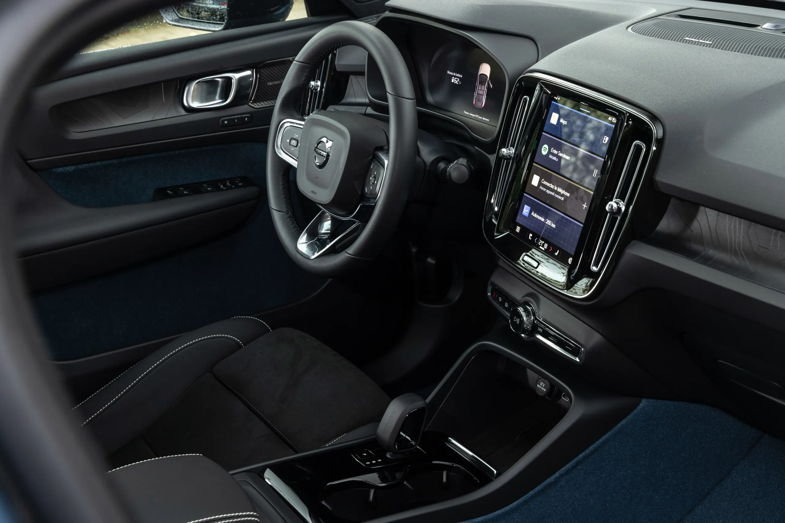 Не стали мудрствовать лукаво и с интерьером. Да, салон здесь такой же, как в электро XC40 Recharge, но благодаря нескольким важным деталям, воспринимается он немного иначе. Создатели С40 уверяют, что вдохновлялись скандинавскими пейзажами и старались сделать интерьер умиротворяющим. Но первое впечатление он произвел как раз бодрящее. Дело в том, что пол дверные карты и боковины центрального тоннеля отделаны материалом синего цвета, в то время как остальные цвета в салоне темные. Обратная комбинация (светлый верх-темный низ) периодически встречается, но вот такая – редкий случай.